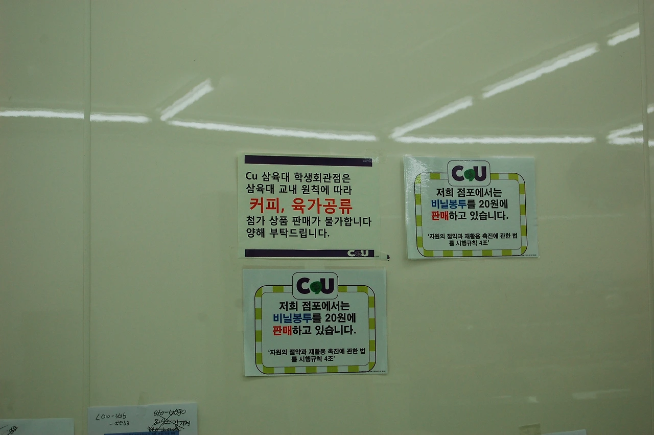 삼육대에서 영업 중인 편의점에서는 담배와 술은 물론 커피와 햄(육가공류)도 팔지 않는다. 계산대에서 해당 안내 문구를 볼 수 있으며, 콜라 역시 찾아볼 수 없다.(그 자리에 사이다와 맥콜이 있다.) 그럼 도대체 뭘 사먹을 수 있는지가 궁금해질텐데... 생각보다 선택지가 좁지 않다. 이를 제외한 다른 음료와 과자, 컵라면 등이 가득하여 학생들의 간식과 먹거리를 충족해 주고 있다.