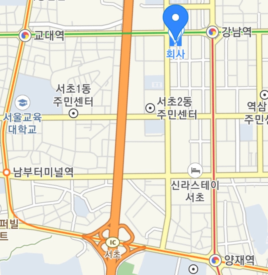 "이리로 가시면 교대구요. 저쪽으로 가시면 강남역인데, 그 사거리에서 오른쪽으로 꺾어서 쭉 가시면 양재입니다. 좀 멀어요."