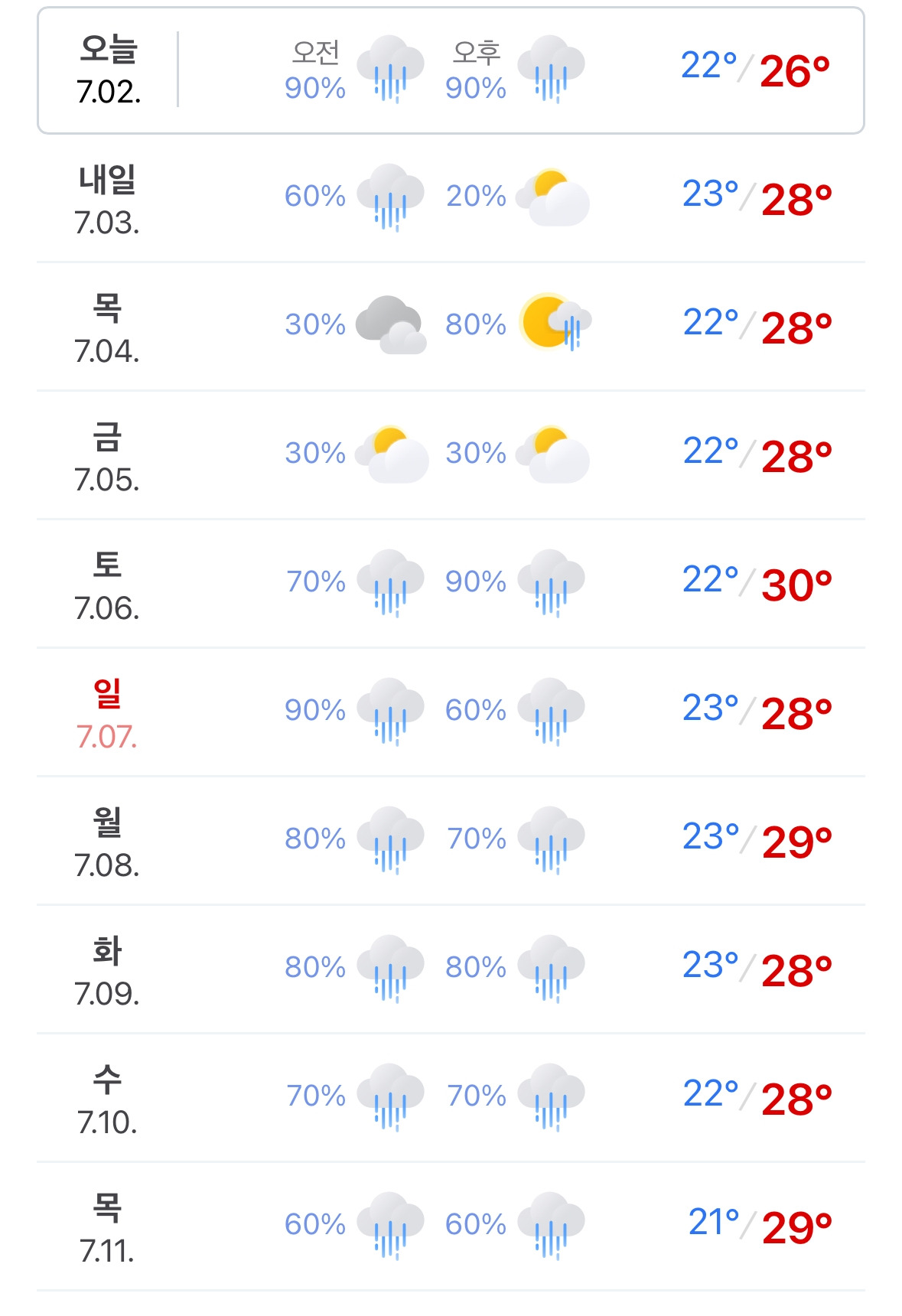 일기예보를 검색해 본다. 다음 주까지 온통 우산 일색이네. 한동안 걷기는 못하겠다는 생각이 먼저 떠오른다. 곧이어 수영을 배워둬서 다행이라는 생각도 든다. 몸매 관리가 아닌 정신 관리를 위해 몸을 써야 하는 필요성이 점점 절실해진다. 내가 쌓은 하루치 체력이 그날의 마음의 평화와 직결된다. (나이 드니 완충도 잘 안되나 보다. 독서도, 운동도 며칠에 한 번 해서는 어림도 없다.)