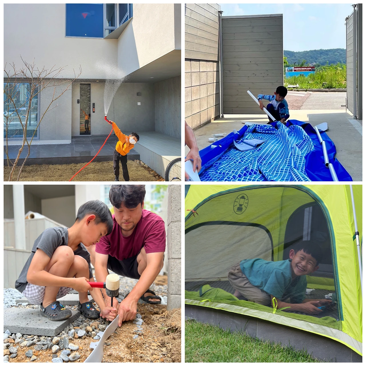 마당에 놀러 온 곤충을 관찰하고, 잔디에 물을 주며 물놀이를 하고, 날씨가 좋은 날은 데크에 그늘막을 펴고 종일 안에서 시간을 보내기도 한다. 아빠와 엄마가 하는 페인트칠을 돕고, 여름 대비 마당 수영장을 직접 조립하고, 하굣길에 만난 예쁜 돌멩이를 주워 마당을 꾸미기도 한다. 밖에서 주택 단지 아이들 소리가 들리면 킥보드를 끌고 나가 함께 타기도 하고 땅을 파서 개미집을 만들며 놀기도 한다.