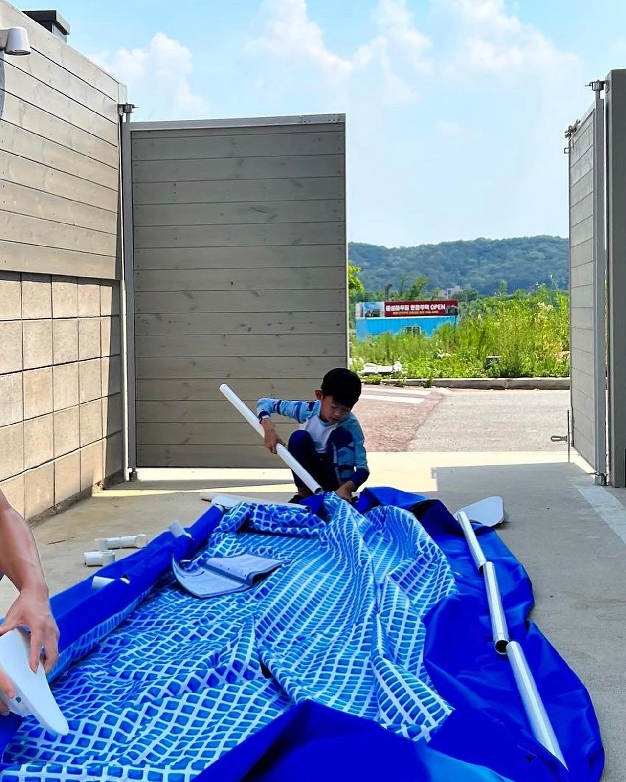 아들과 함께 요리한 라볶이로 점심을 먹은 뒤, 마당에 나가 간이 풀장을 설치했다. 첫 설치부터 주도적으로 참여했던 아들은 이제는 설명서를 보지 않고도 척척이다.