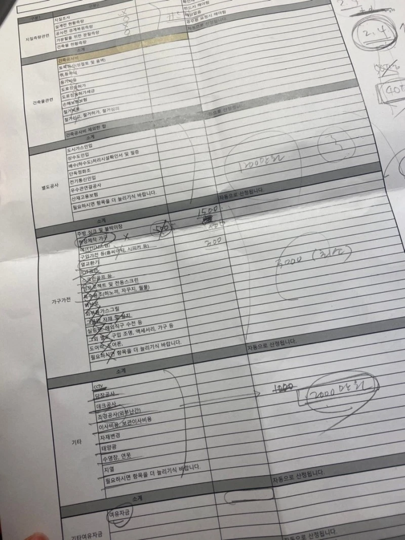 부대비용에 포함되는 내역은 사진에서 확인할 수 있듯이 정말 다양하다. 통상적으로 이 비용을 1억 정도 잡는데 이것 역시 5천만원이 들 수도 있고 2억이 들 수도 있다. 일단 토지와 건축 후 취등록세는 땅값이 비쌀수록, 고가 주택일수록 비싸다. 그리고 설계비와 감리비도 몇백에서 1억까지 그 편차가 아주 크다. 또한 토목공사, 인입비 등이 들지 않는 토지도 있고 조경, 대문, 담장도 선택에 따라 몇천이 들 수도, 1억 이상이 들 수도 있다. 우리 집의 경우에는 조경과 대문은 셀프, 담장은 절반 정도 셀프로 시공했음에도 이 세 가지 비용만 몇천만원이 들었다. 붙박이 가구와 가전 역시 어떤 제품을 선택하느냐에 따라 천차만별이고, 수영장, 태양광, 열교환기, 전기차 충전시설 등을 추가한다면 가격은 더 올라가게 된다.
