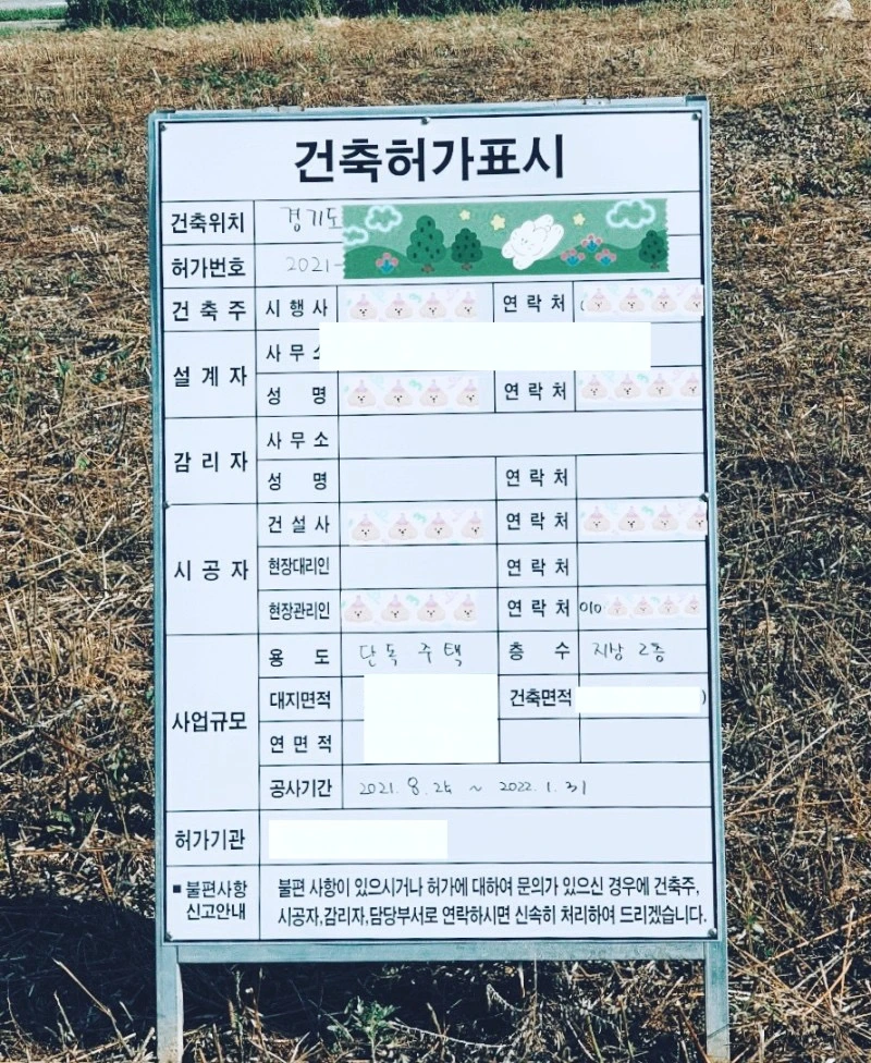 드디어 우리 땅에 건축 허가판이 세워졌다. 몇 번의 고비를 넘긴 후 시작된 이 여정의 출발을 알리는 신호탄에 벅차서 눈물이 날 것 같았다. 나란히 적힌 건축사님과 남편의 이름을 보니 더욱 그러했다. 아마도 1월부터 함께 '우리 땅', '우리 집'이라 부르며 머리를 맞대고 고민해 온 시간들 때문이리라. 이제 새로이 '우리'가 될 현장 소장님의 성함도 오늘 처음 확인하였다.