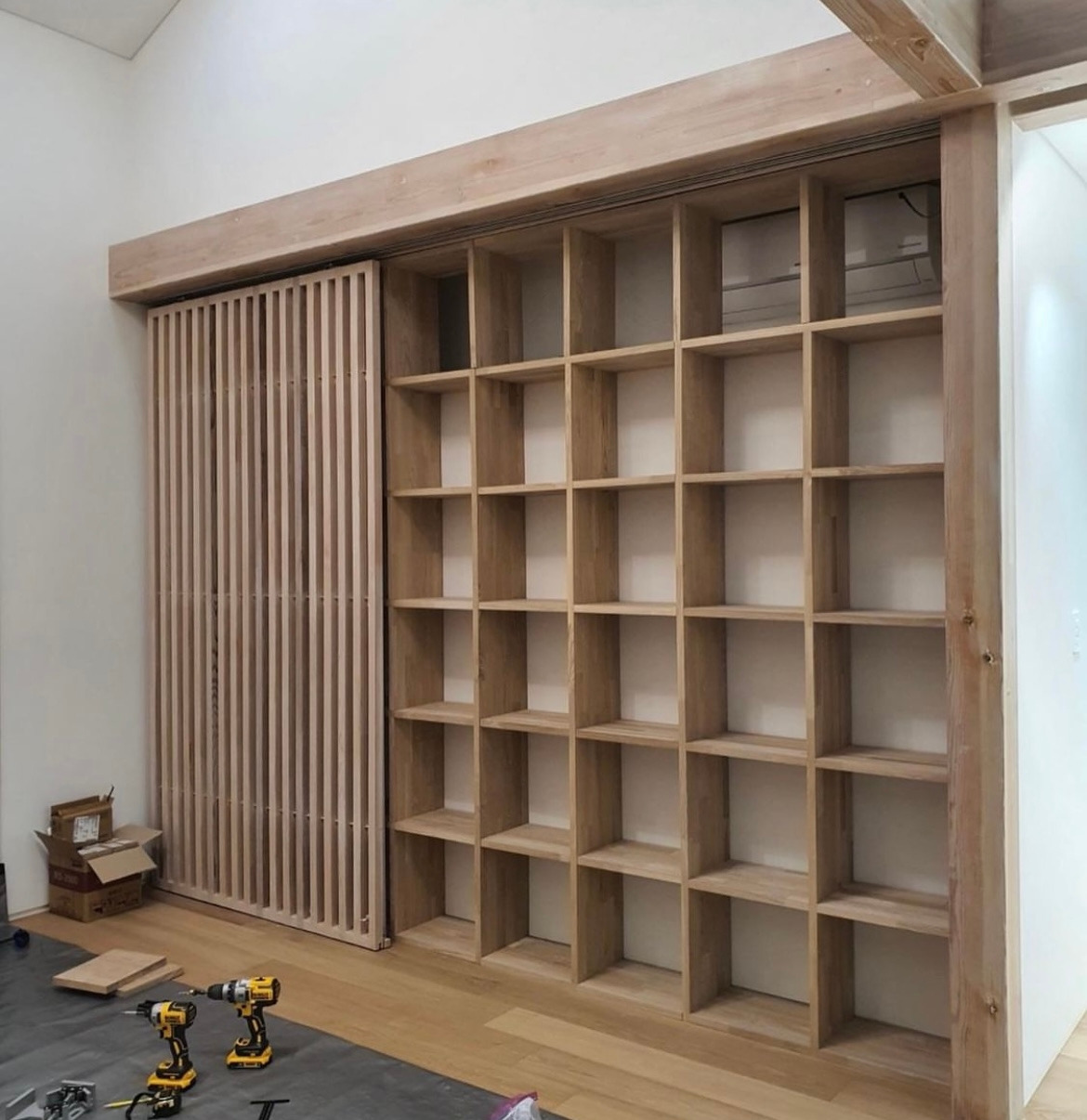 사실 이번에도 목공을 시작하겠다고 할 때 어느 시기에 어떻게 들이댈지 몰랐을 뿐 어느 정도 예상은 했었다. 고백은 상남자 스타일로 직진하더니 취미생활은 이렇게 뭉근하고 집요하게 빈틈을 노리며 잠입하니 긴장을 늦추어서는 안 된다. 처음엔 거실에 넣을 붙박이 책장을 만드는 것으로 시작했다. 워낙 부피가 크고 혼자서 들 수 없는 무게였기에 함께 드는 것만 도와달라고 했다. 하지만 어느새 나는 바니쉬 칠을 하고 있었고 샌딩을 하며 현타가 왔다. '아, 내가 또 이러고 있구나.' 결국 또 원치 않던 나의 능력이 1포인트 상승했다. 책장 잡아주기 도우미로 가볍게 시작했던 나의 목공체험은 욕실장, AV장, 협탁 만들기로 이어졌고 급기야 담장과 대문을 셀프로 시공하게 되었다. 주말에 남편이 담장 골조에 나무를 잘라 붙여두면 나는 평일에 칠하기 담당이었다. 삼면이 2M 인 담장을 무려 양쪽으로 세 번씩, 총 아홉 번! 그 덕에 하나 둘 올라오기 시작한 훈장 같은 기미는 이제 수를 헤아리다 잠들 지경이다.