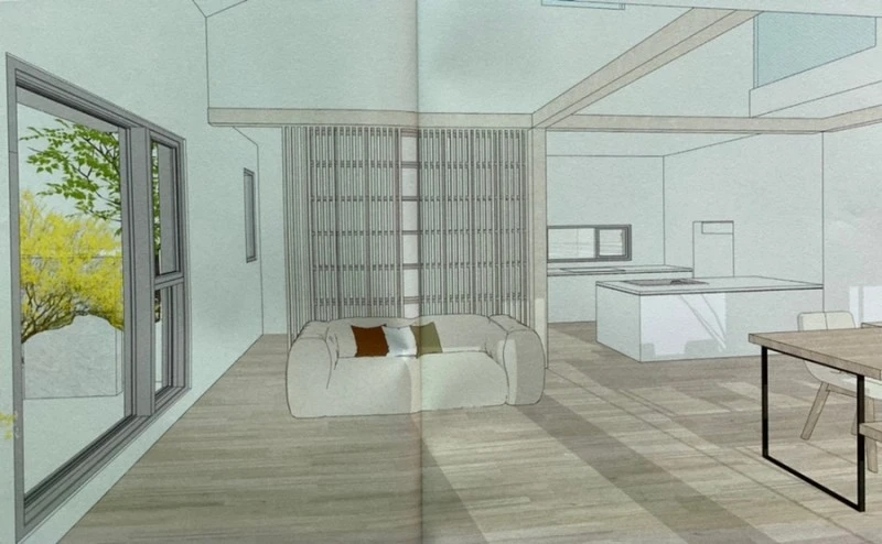 대면형 주방으로 동선이 자유로웠으면 하고요. 거실이나 마당에서 놀고 있는 아이를 보면서 요리할 수 있다면 좋겠어요.아, 참! 주방이 너무 클 필요는 없지만, 옆에 미닫이 문이 달린 다용도실은 필요해요. 그곳에 냉장고를 포함한 주방 가전을 모두 수납하고 싶어서요.”