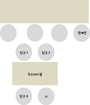 카운터 앞에 있는 큰 테이블에는 젊은 남녀가 8명 정도 앉아 있었다. 외투를 옷걸이에 걸고 자리에 앉는데 친구들이 갑자기 들뜬 표정이 되었다. 알고 보니 옆 테이블에 연예인이 있다고 했다. 이런 일이 일어날 수 있구나 싶었다. 역시 서울은 다르다 생각했다. 두근두근. 우리는 설레는 마음으로, 연예인과 한 공간에 있다는 걸 마음껏 느끼며 수다 삼매경에 빠졌다. 그런데 맞은편에 있는 (친구 1)과 (친구 2)가 갑자기(친구 3)과 (나)를 보고 깔깔 웃었다. 왜 웃냐고 물어보니 이렇게 말했다. (아래 그림참고)