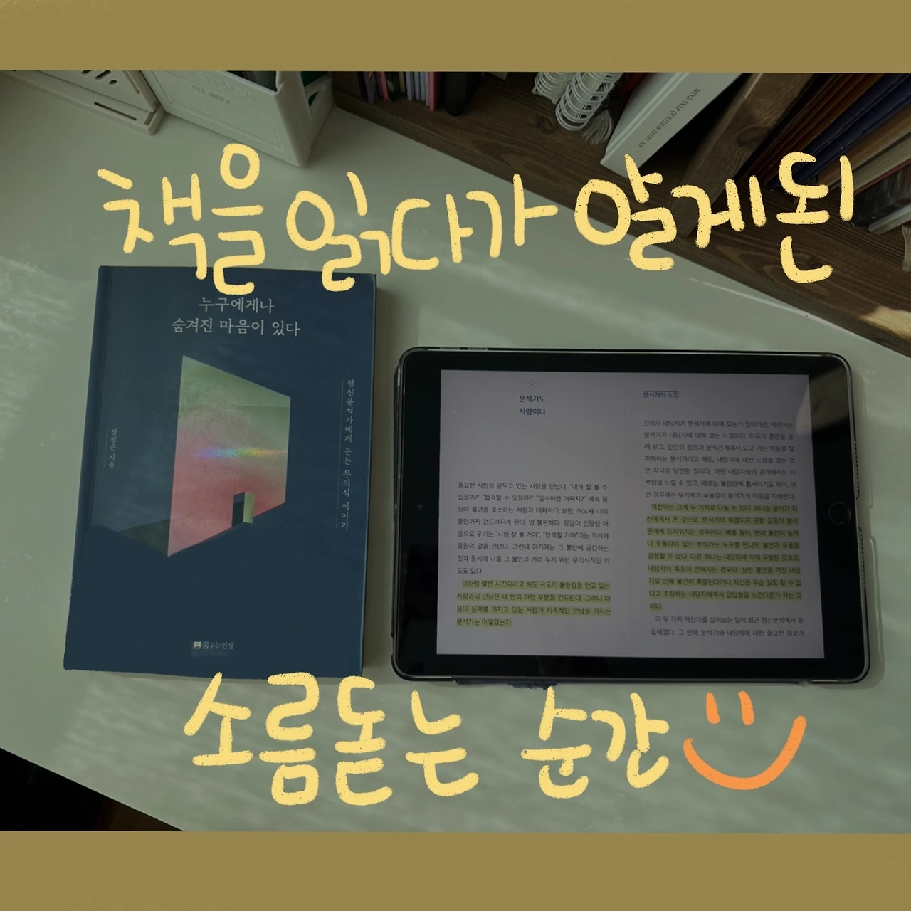 순간 이런 생각이 들었습니다. 나는 과연 그때 이 책을 읽었다고 할 수 있는 것인가? 읽었던 책을 이렇게 새로운 마음으로 읽을 수 있다고?? 글이 흥미로와서 두 번째인지도 모르고 읽은 걸까요? 심지어 다시 읽으며 붙여놓았던 인덱스와 정확히 일치하는 부분에 하이라이트가 체크되어 있었습니다. 무려 80% 이상이요. 이 책은 제가 읽은 것이 분명합니다.