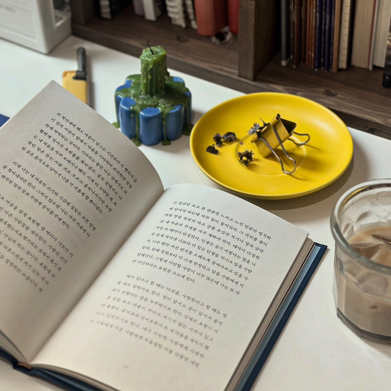 책상을 닦고 자리에 앉으니 고소한 카페라테가 생각나서 일리머신으로 에스프레소를 한잔 내립니다. 컵에 우유와 얼음을 넣고 에스프레소를 부어줍니다. 카페에서 먹던 카페라테처럼 예쁘게 퍼지지 않고 바로 편의점 커피우유색이 됩니다. 그래도 만족스럽습니다. 읽다가 고이 닫아둔 책을 꺼내어 읽어봅니다. 어떻게 이 마음을 이렇게 표현했을까? 공감을 하고 박수를 치며 읽다 보니 오늘은 조금 특별한 날처럼 느껴집니다. 뒤편에 있는 서랍을 뒤져서 소품샵에서 사 왔던 종이향수를 꺼냅니다. 라이터 불을 붙이고 종이향을 맡으며 책을 읽어야겠다는 생각이 듭니다. 그러다 보니 책에 집중하고 싶은 마음과 예쁘게 세팅하고 싶은 마음이 잠시 충돌합니다. 독서가 다소 산만해지지만 시계를 보니 아직 10시 2분밖에 되지 않았습니다. 눈 깜짝할 새에 12시 30분이 될 것만 같지만 오늘은 조금 여유롭게 오전을 보내기로 합니다.