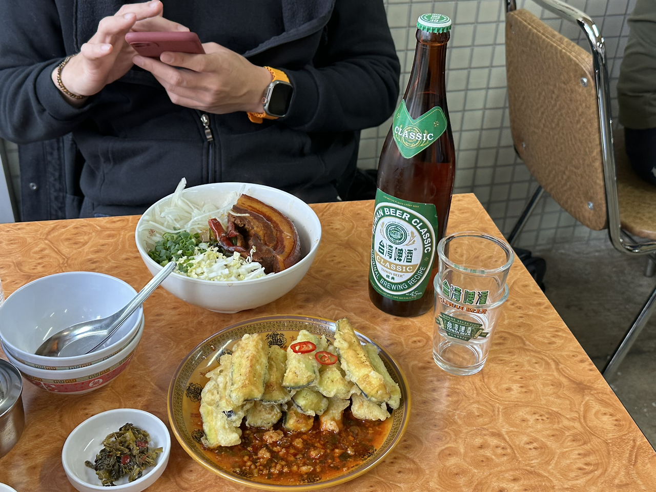 이 날은 특별히 점심이지만 낮에 맥주를 한잔 하기로 했습니다. 낮에 먹는 술, 맥주에 대한 그 시원함과 해방감을 너무나 느끼고 싶었거든요. 이국적인 음식과 함께 맥주를 한잔 먹는다니. 설레었습니다. 그날 아침 첫째 등교준비와 둘째 등원은 정말 쌩쌩한 기운으로 마쳤습니다. 얼른 대중교통을 타고 오픈시간에 맞춰 가게로 향했습니다. 우육탕면과 하루에 15그릇만 만드는 돼지수육덮밥과 가지튀김과 맥주를 시켰습니다. 맥주잔이 작아서 귀엽고 기분도 좋았습니다.