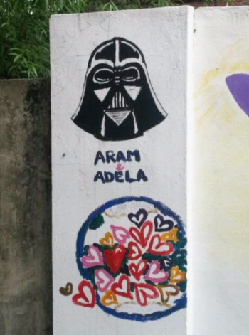 곧 부모가 될 커플이 함께 벽을 장식했어요. 다스베이더를 좋아하는 남편과 사랑으로 넘치는 부인이네요.