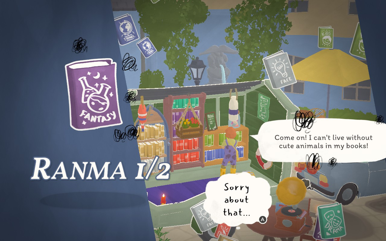 일단 이 게임이 현실을 소환하는 매개는 메커닉이 아니라 (율의 단어를 쓰자면) ‘게임 월드’의 내부에 있다. 게임이 판매하는 책은 모두 현실 세계에 존재하는 책들이다. 대표적으로 대부분의 ‘희곡’ 책들은 다 셰익스피어의 책이다. 그 외에도 고전 명작들, 근래 유행한 영 어덜트 소설들, 《란마 ½》같은 유서깊은 일본 만화에 심지어는 한국 웹툰의 단행본도 몇권 존재한다. 이 ‘설정적 차원’은 이 책들의 내용이 게임 메커닉에서 사용된다는 지점에서 흥미로워진다. 게임을 진행하다 보면 이 게임이 일종의 ‘서비스 제공형의 매지니먼트’ 게임이라는 사실을 깨닫게 된다. 이를테면 「커피 토크」나 「스트레인지 호티컬처」, 「네오 캡」같은 NPC 손님들에게 ‘반응하며’ 상황에 대응해나가는 행위의 장르다.