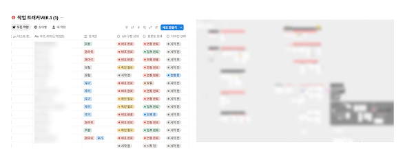 디자인 자체는 정해진 기간 내에 완료했지만, 개발팀에게 진행 상황, 개발 조건, 작업 순서 등의 정보를 즉시 제공하기 어려웠다. 결국 작업 중간에 급하게 트래커를 만들었던 기억이 있다. 이 경험을 통해 개발자와 디자이너 간의 원활한 소통을 위해서는 문서 작업을 미루지 않는 것이 핵심임을 절실히 배웠다.