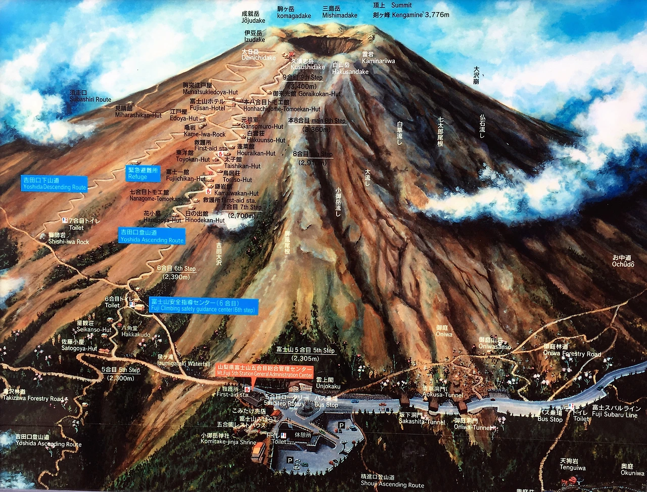 후지산 버스종점은 해발 2305m나 되는 제법 높은 곳에 있다. 이곳에서부터 등산을 시작해 3715m의 후지산 정상까지 가야 하니 고도 차이가 적지가 않다. 하루에 천 미터가 넘는 산행을 할 경우 가장 큰 문제가 언제나 고산병 문제이다. 등산로 입구에 가장 많이 보이는 안내판 내용도 바로 당일치기 후지산 <미친 산행>을 하지 말라는 팻말들이다. 왕복 15Km가 채 안 되는 거리이다 보니 건장한 사람들이라면 아침에 출발해 저녁 늦은 시각이면 충분히 돌아올 수 있을 거리이다. 그러다 보니 간혹 사고(특히 고산병)가 발생하기도 한단다.