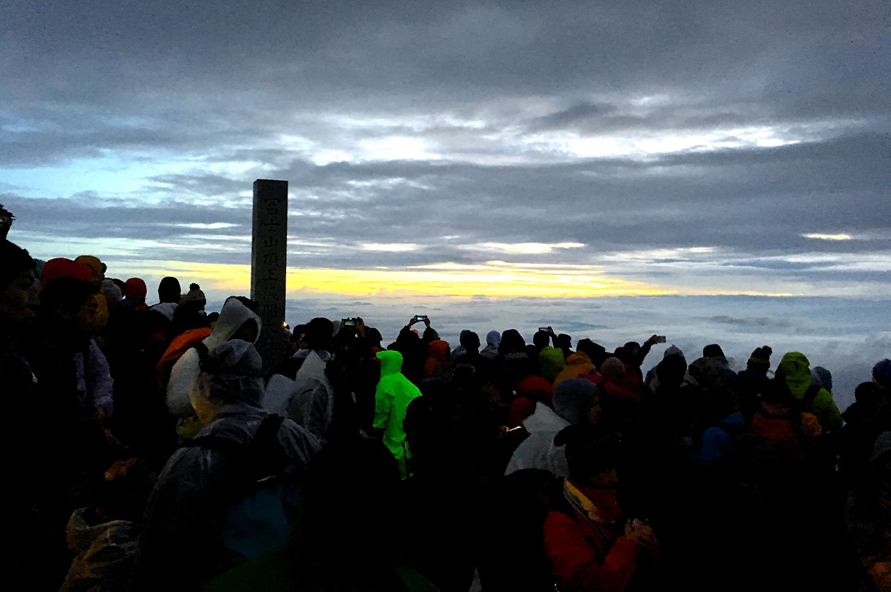 한 시간 반이면 오를 거라던 정상까지의 등산로는 다행히 두 시간 만에 당도할 수 있었다. 정상에는 어느새 올라왔는지 진짜 입추의 여지없이 사람으로 가득하다. 이제야 늦게 출발하면 정상에 자리가 없다는 말이 실감이 났다. 3시 조금 넘은 시각부터 해가 뜨는 5시경까지 무작정 기다리려니 슬슬 추위가 엄습해 온다. 빗줄기는 조금 수그러 들었지만 그래도 여전히 빗방울이 날린다. 바람까지 불면서 추위는 마치 한겨울같이 느껴진다. 심지어 이빨까지 부딪치며 한기가 온몸으로 스며든다.
