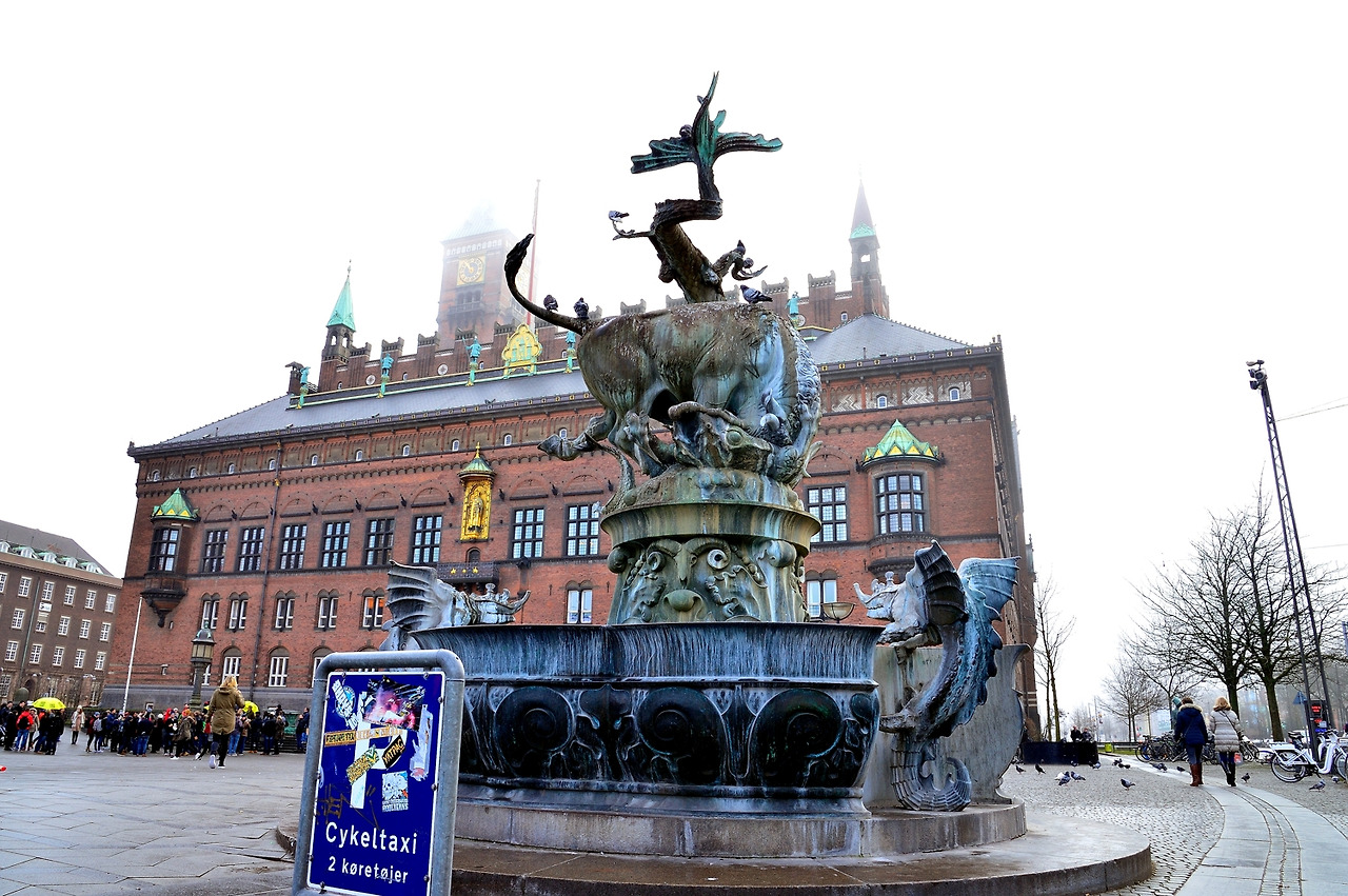 넓은 광장이 나오고 그 앞에 시청 건물이 우뚝 서있다. 시청사 앞에는 멋진 용으로 장식을 한 분수가 있다. 이 작품은 건축가 마틴이 1905년에 만들었다고 하는데 그 규모가 제법 크다. 시청사 건물 한복판에는 코펜하겐을 부흥시킨 주교 압살론의 황금상이 붙어있어 권위를 더한다.