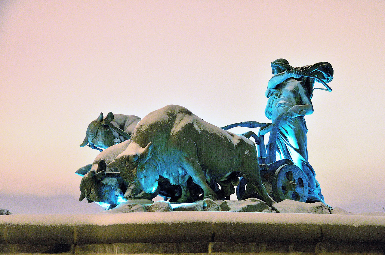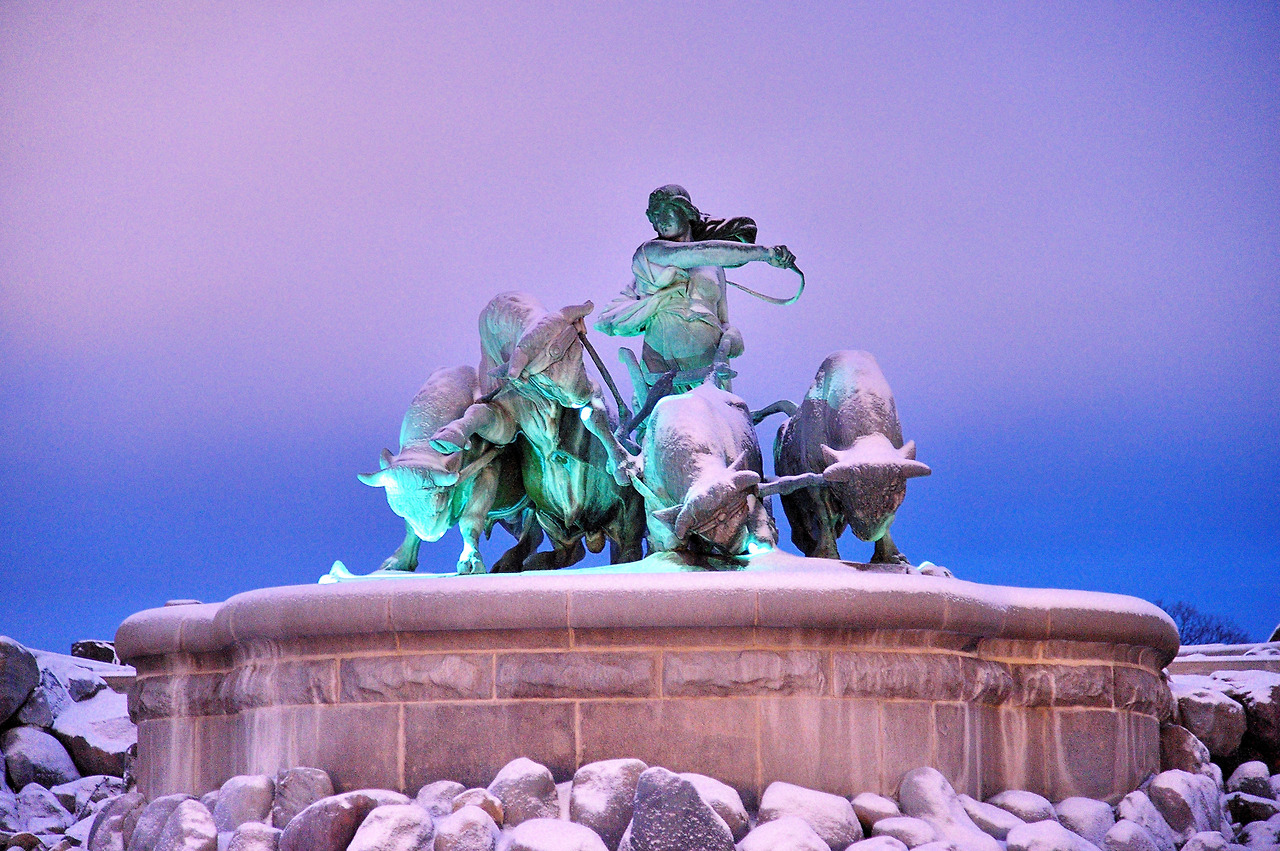 드디어 '성 알반 교회' 뒤로 돌아서면 게피욘 분수를 만난다. 코펜하겐에서 가장 규모가 크고 웅장한 분수, 한 겨울 어둠 속에서도 황소들의 씩씩거리는 숨결이 뜨겁게 느껴진다. 이 분수는 덴마크의 유명한 맥주회사 칼스버그가 창립 50주년을 기념해 진행한 프로젝트의 결과물 중 하나이다. 덴마크 건축가 안드레아스가 제작한 게피욘 분수는 스칸디나비아 신화 속 안주인이자 다산의 여신 게피욘이 황소를 몰고 밭을 일구는 모습으로 1908년에 만들었다. 그 규모가 제법 웅장하고 멋지다.