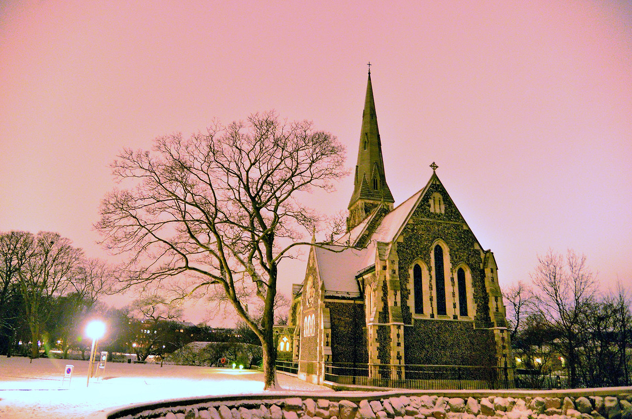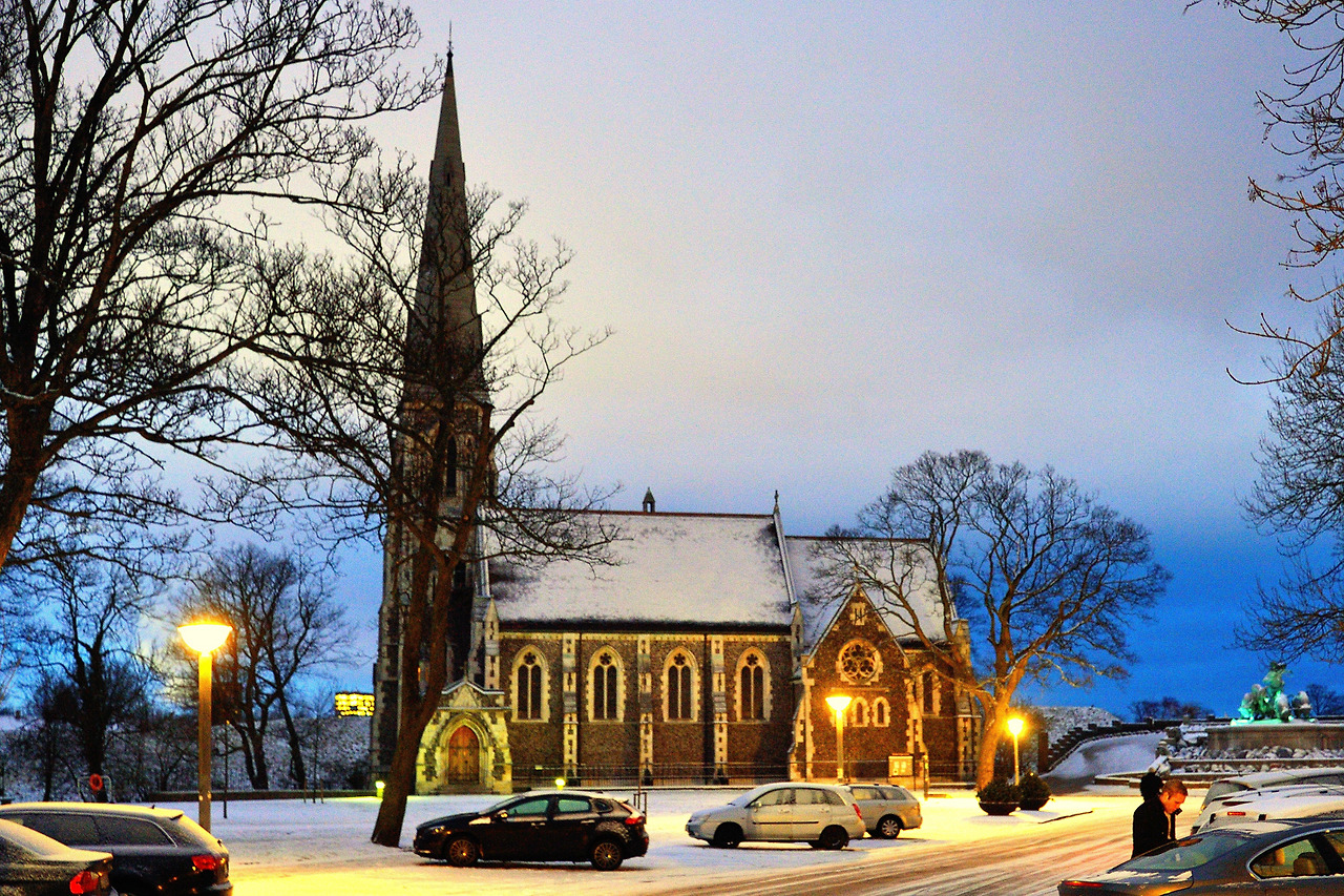 도로에는 어둠이 깔리고 눈발이 날리지만 어느새 ‘성 알반교회’가 있는 곳까지 왔다. 이 교회는 그 규모가 그리 크지는 않지만 코펜하겐에 있는 유일한 성공회 교회인데 1885년 코펜하겐에 있는 영국인들을 위해 건립했다고 한다. 교회 내부는 스테인드글라스로 예쁘게 장식을 했는데, 눈 내리는 겨울 저녁 교회의 모습이 마치 크리스마스 카드에 그려진 모습처럼 포근하고 예쁘다.