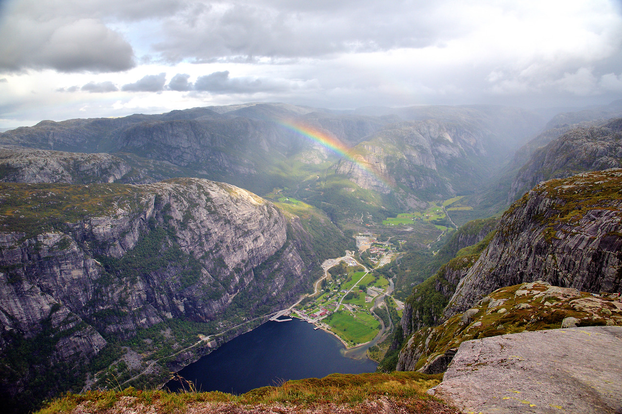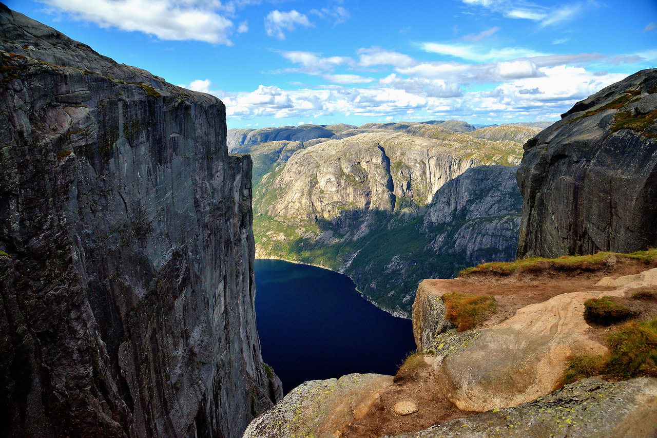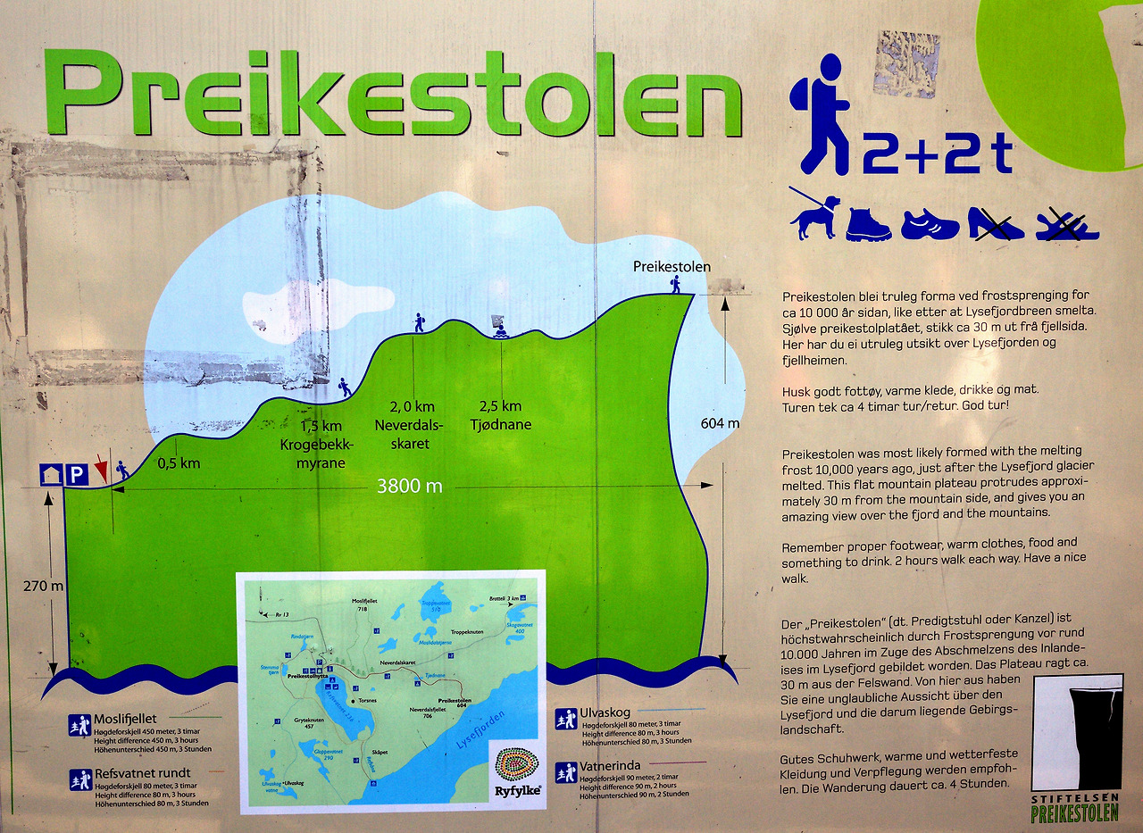 아무튼, 프라이케스톨렌(Preikestolen)은 높이 603미터의 수직 절벽으로 되어 있다. 피요르드 위에 위치한 이 바위는 마당바위처럼 넓적한데 볼수록 대단한 느낌이다. 이 절벽 아래로 보이는 피요르드 역시 장관이다. 또한 이 피요르드 끝부분에는 1,110m 높이의 세락(Kjerag) 산이 있다. 바로 그 산 정상 부근 계곡에 유명한 둥근돌 세락볼튼(Kjeragbolten)이 있다.