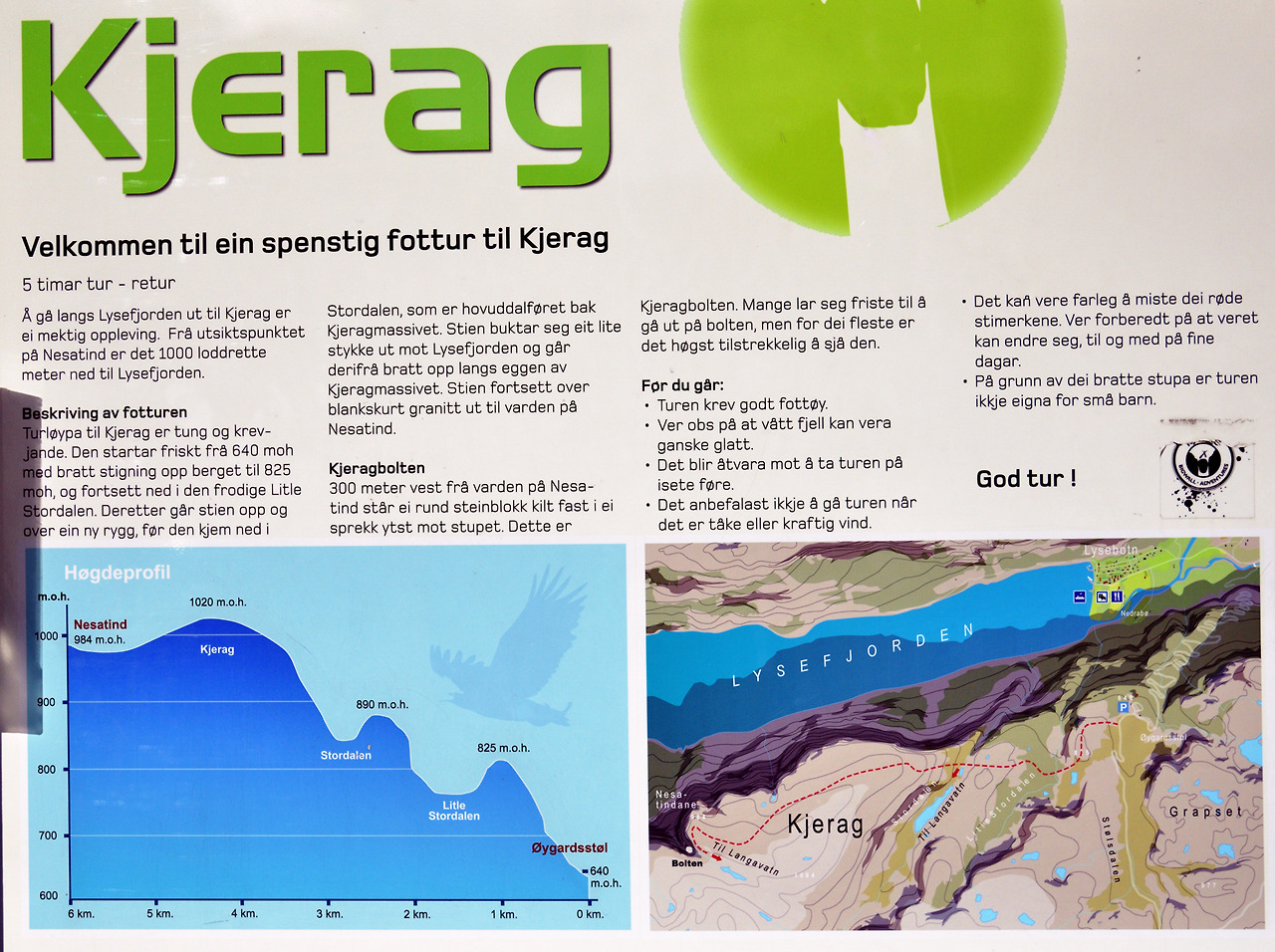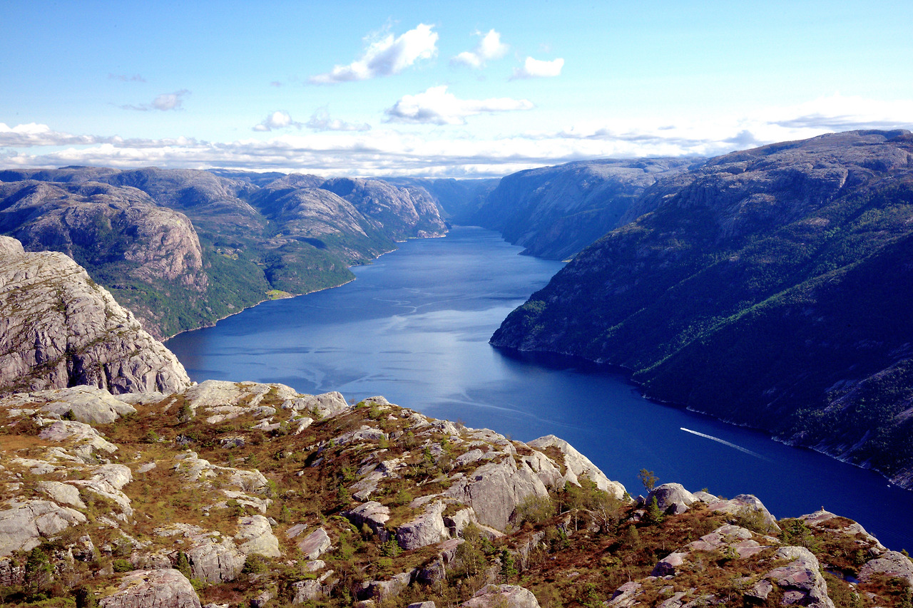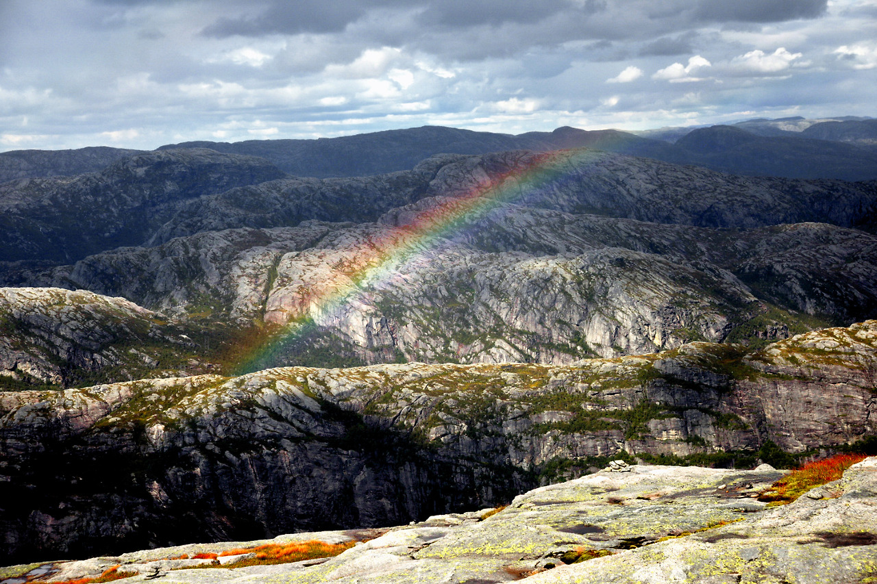 아무튼, 프라이케스톨렌(Preikestolen)은 높이 603미터의 수직 절벽으로 되어 있다. 피요르드 위에 위치한 이 바위는 마당바위처럼 넓적한데 볼수록 대단한 느낌이다. 이 절벽 아래로 보이는 피요르드 역시 장관이다. 또한 이 피요르드 끝부분에는 1,110m 높이의 세락(Kjerag) 산이 있다. 바로 그 산 정상 부근 계곡에 유명한 둥근돌 세락볼튼(Kjeragbolten)이 있다.