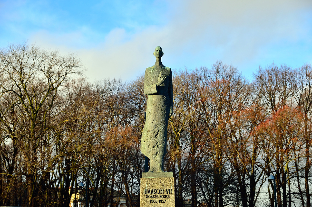 * Haakon 7세(1872-1957)의 동상: 하콘 7세는 1905년 11월 노르웨이 왕으로 취임한다. 그동안 노르웨이는 스웨덴과 연합국 형태로 지배를 받아왔는데 스웨덴으로부터 연합국 해체 동의를 받고 독립을 한다. 따라서 새로운 독립국가의 왕으로 하콘 7세가 등극을 한 것이다. 하콘 7세는 원래 덴마크 프레데릭 8세의 둘째 아들이었으나 노르웨이 왕위를 물려받고 노르웨이 왕이 되었다. 오른쪽은 오슬로 시내에 있는 하콘 7세 동상