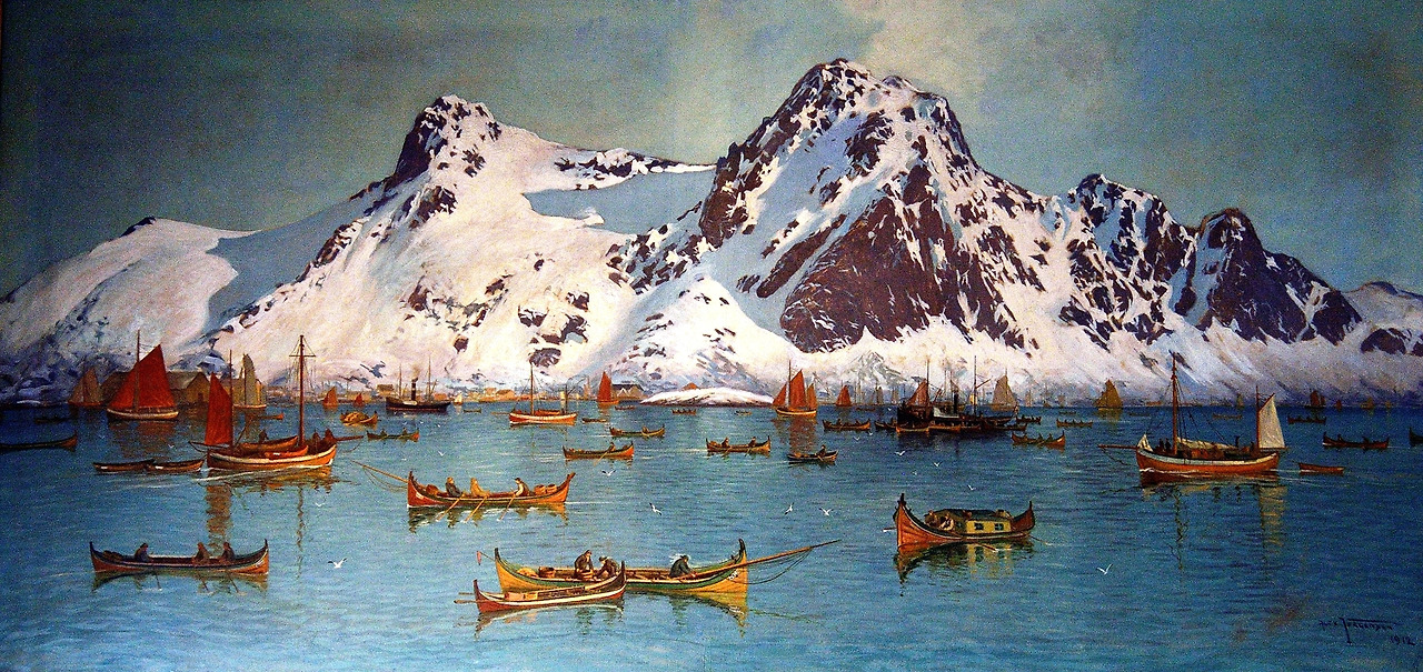 * 보되 박물관에 전시된 로포텐에서 대구잡이하는 모습 그림(100년 전 제작), 대구 건어물 판매루트가 노르웨이 출신 바이킹들의 해외 원정 통로와 거의 일치한다.(오른쪽/스볼배르 박물관 자료)