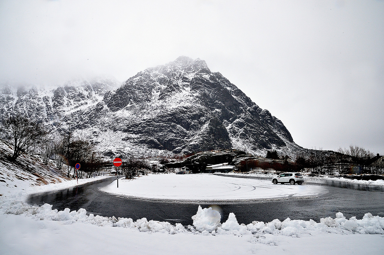 레이네에서 서쪽 끝 마을 오(Å)까지는 20분이 채 안 걸렸다. 진눈깨비가 내리고 있었지만 도로 상태는 좋다. 곳곳에 로포텐 특유의 우뚝 솟은 바위산들이 눈길을 끈다. 거의 큰 나무들은 보이지 않지만 바위와 호수 같은 바다가 장관이다.