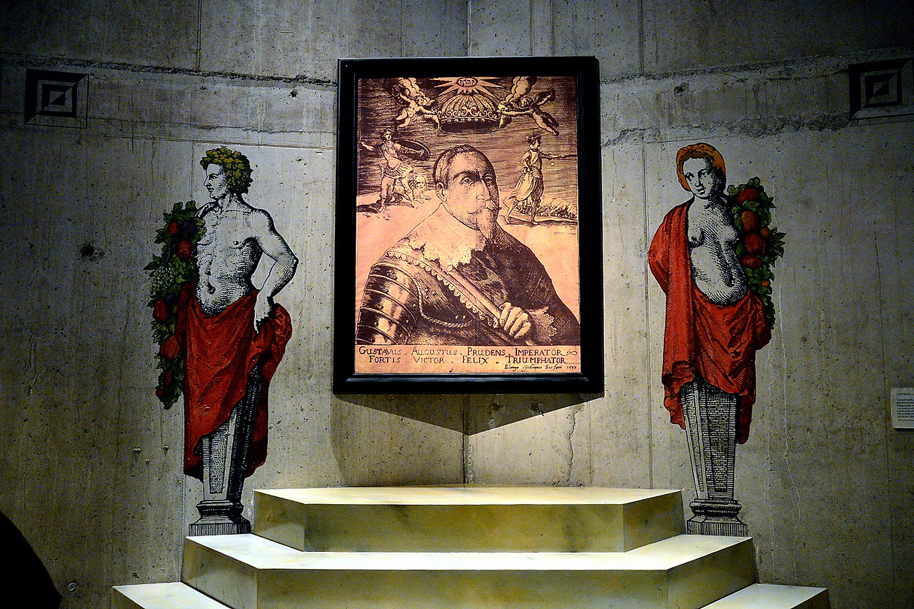 * 위대한 제국의 군주로서 구스타브 2세는 자신을 로마 황제 아우구스투스(Augustus)와 동일시했다. 그래서 구스타브 2세의 초상화를 지키는 병사들은 로마군사들로 배치를 했다. 초상화 아래 글의 내용은, "Wise Ruller, Brave Conqueror, Happy Victor"