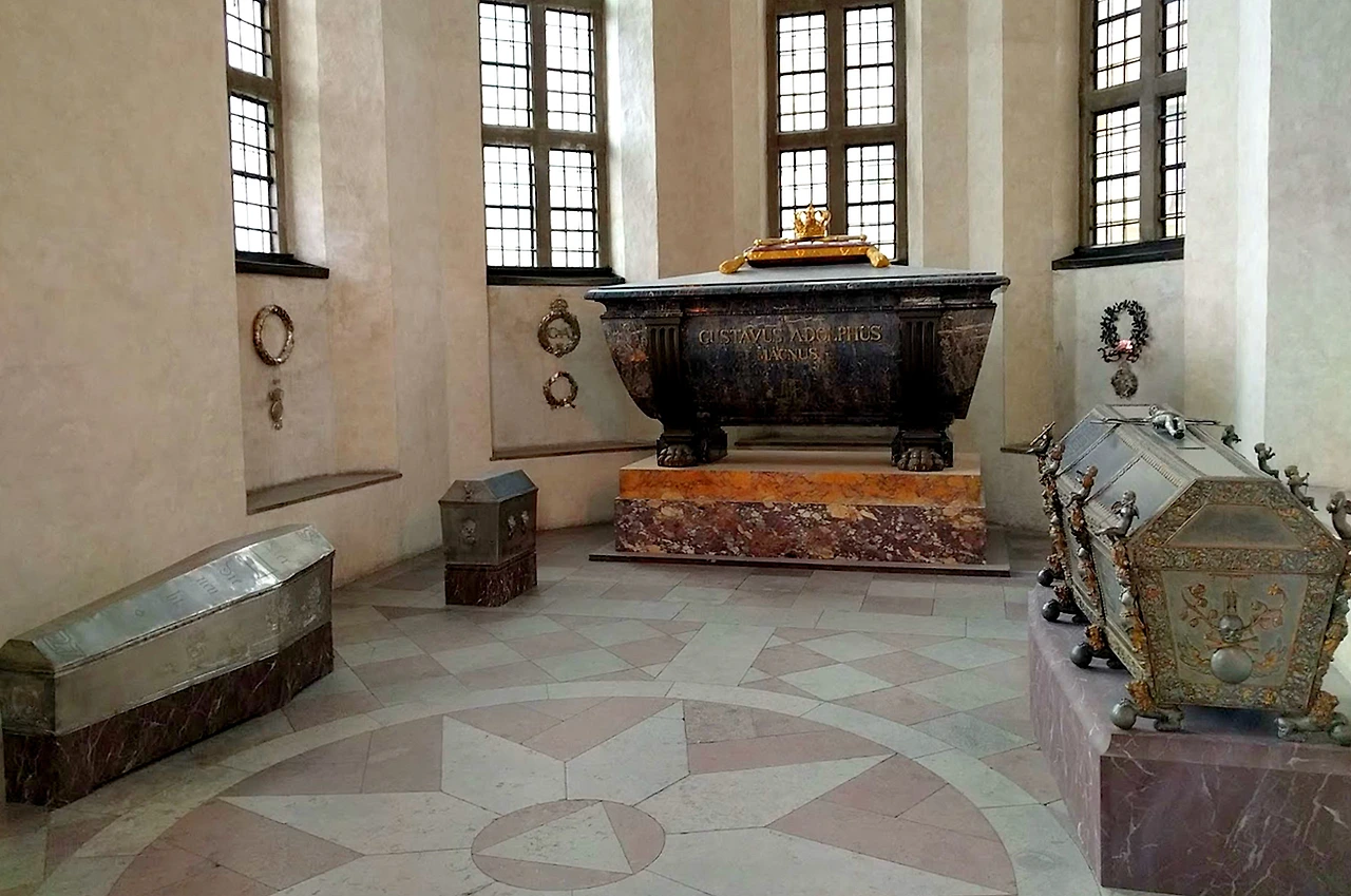 1) 구스타브 2세 초상화(국립박물관 소장), 2) 뤼첸전투에서 죽음을 맞는 구스타브 2세(국립박물관 소장), 3) 스톡홀름 시내에 있는 라다르홀맨 교회에 안치된 구스타브 2세 무덤(가운데)