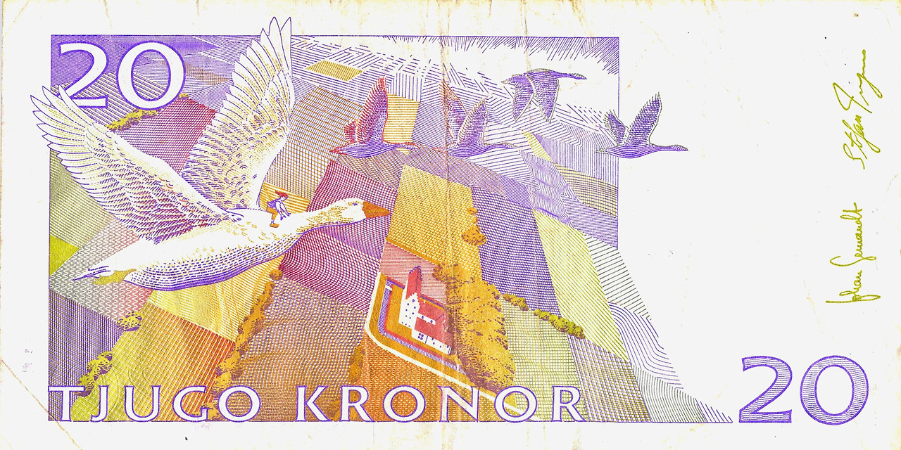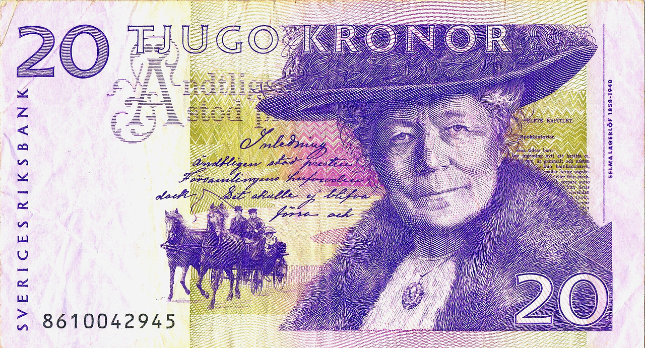 * '닐스의 모험'의 작가 셀마 라게를뢰프가 그려진 스웨덴 화폐, 뒷면에 거위를 타고 날아가는 닐스의 모습이 보인다. 우리나라 화폐에도 '아기공룡 둘리'나 뽀로로를 넣으면 안 될까?