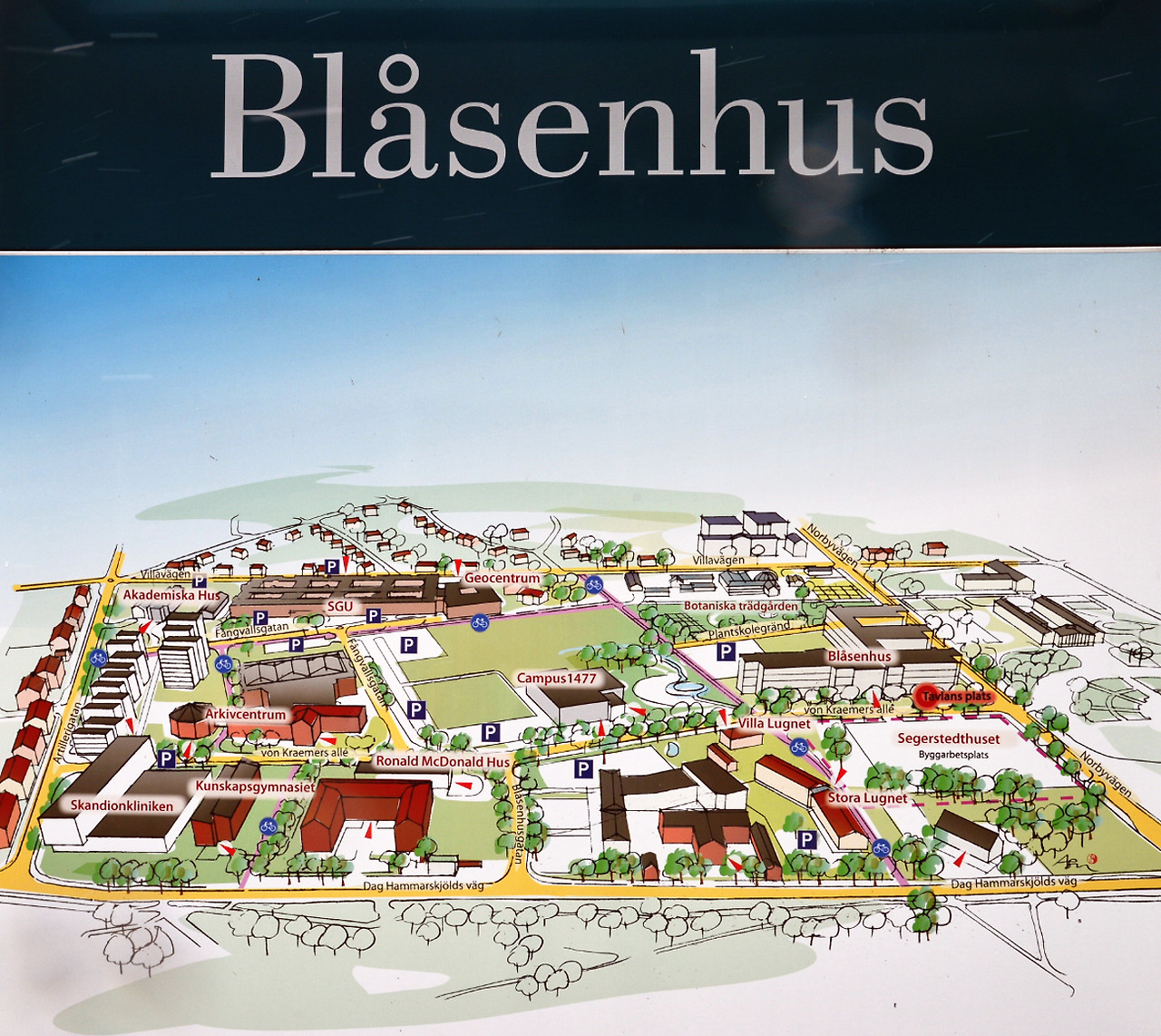 * 웁살라 대학교 건물과 대학 안내도(안내도 한복판에 대학설립 연도 '1477년'을 기리는 건물이 있다.)