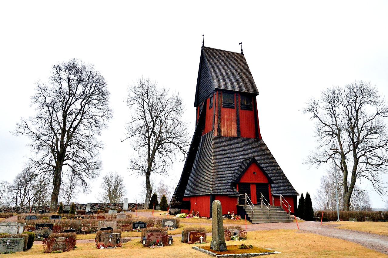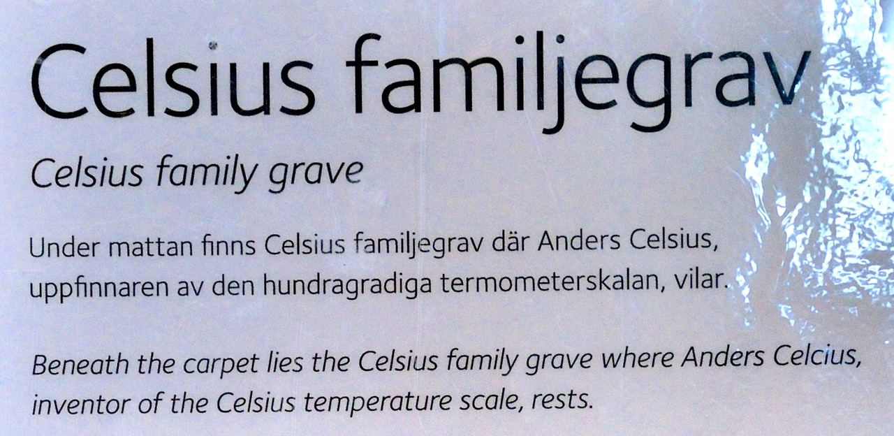 * 교회의 종탑과, 셀시우스 가족이 안장된 교회 바닥 석판(셀시우스는 섭씨온도를 제창한 스웨덴 물리학자)