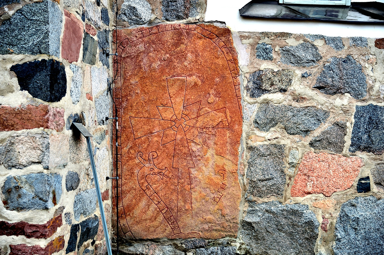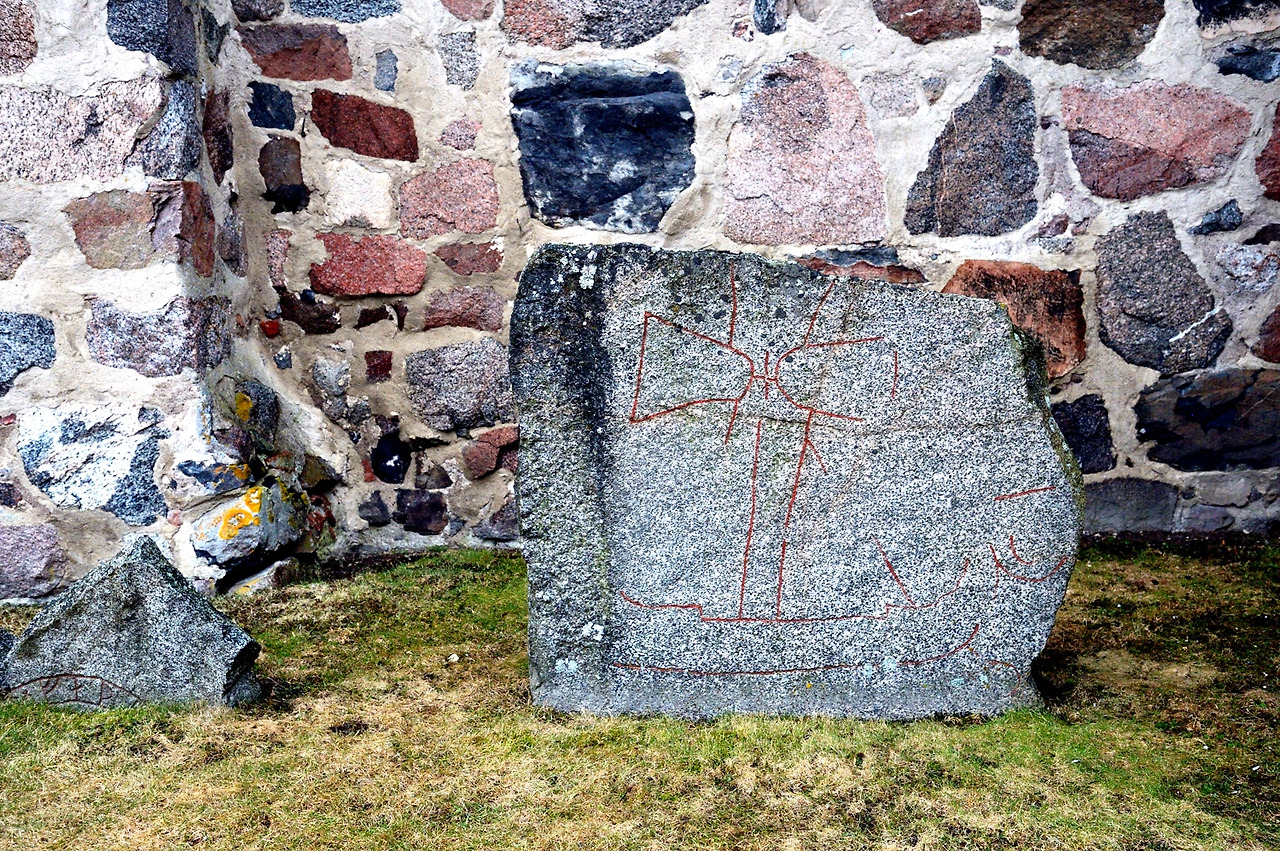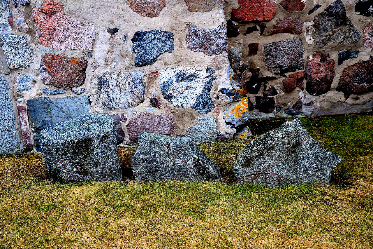 * 교회에 남아있는 루네스톤들(가운데 사진은 루네스톤을 아예 교회 벽면에 넣고 공사를 마감했다.)