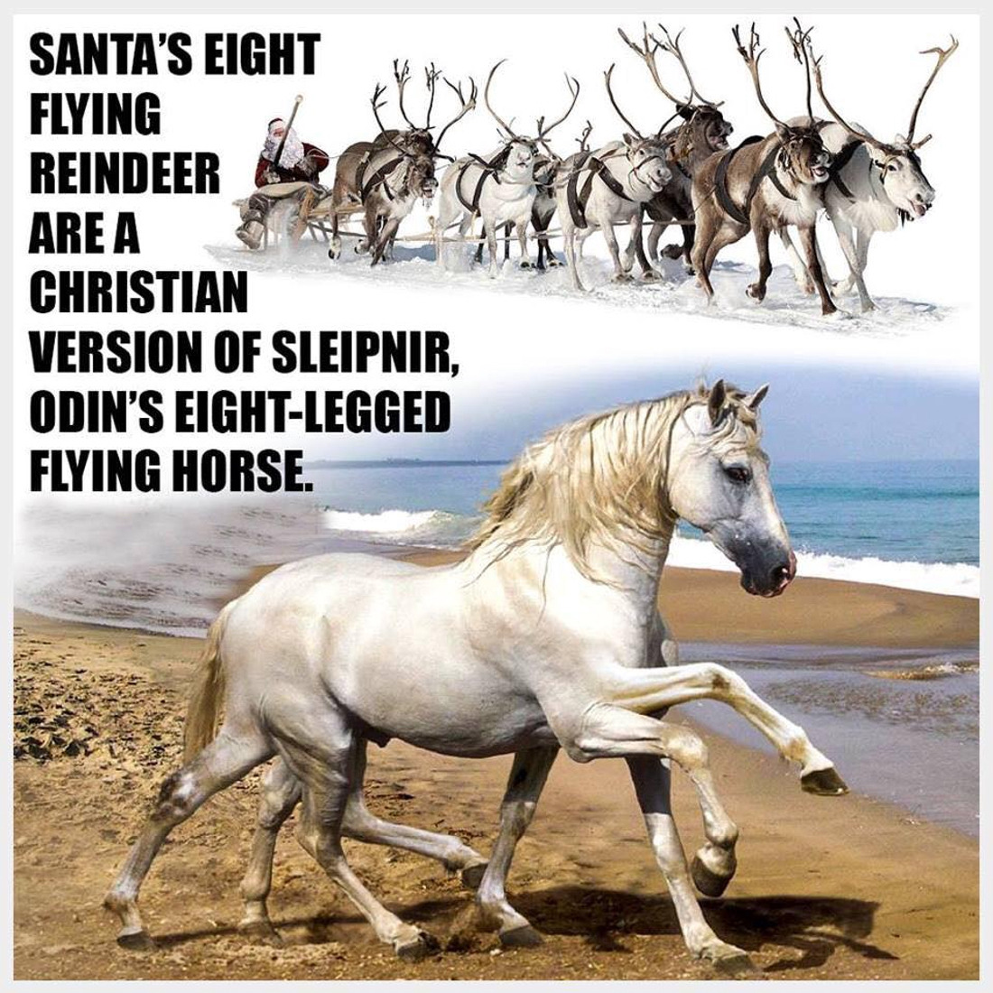 * 다리 8개 달린 오딘의 슬레이프니르가 산타의 루돌프 사슴 8마리 썰매의 원조라고 주장한다.