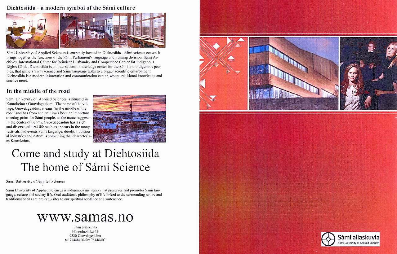 -사미 대학의 응용과학연구센터는 노르웨이 구오브다게아드누(Guovdageaidnu) 주 케이토키노(Keitokaino) 시에 위치하고 있다. 그런데 구오브다게아드누(Guovdageaidnu)라는 말 은 “길 가운데에서”라는 뜻을 가지고 있다. 이 지역 이름은 이미 오래전부터 사용해 왔으며, 북유럽 사미인들이 라플란드에서 매번 만나는 중요한 거점 지역으로 활용해 온 곳이기도 하다.