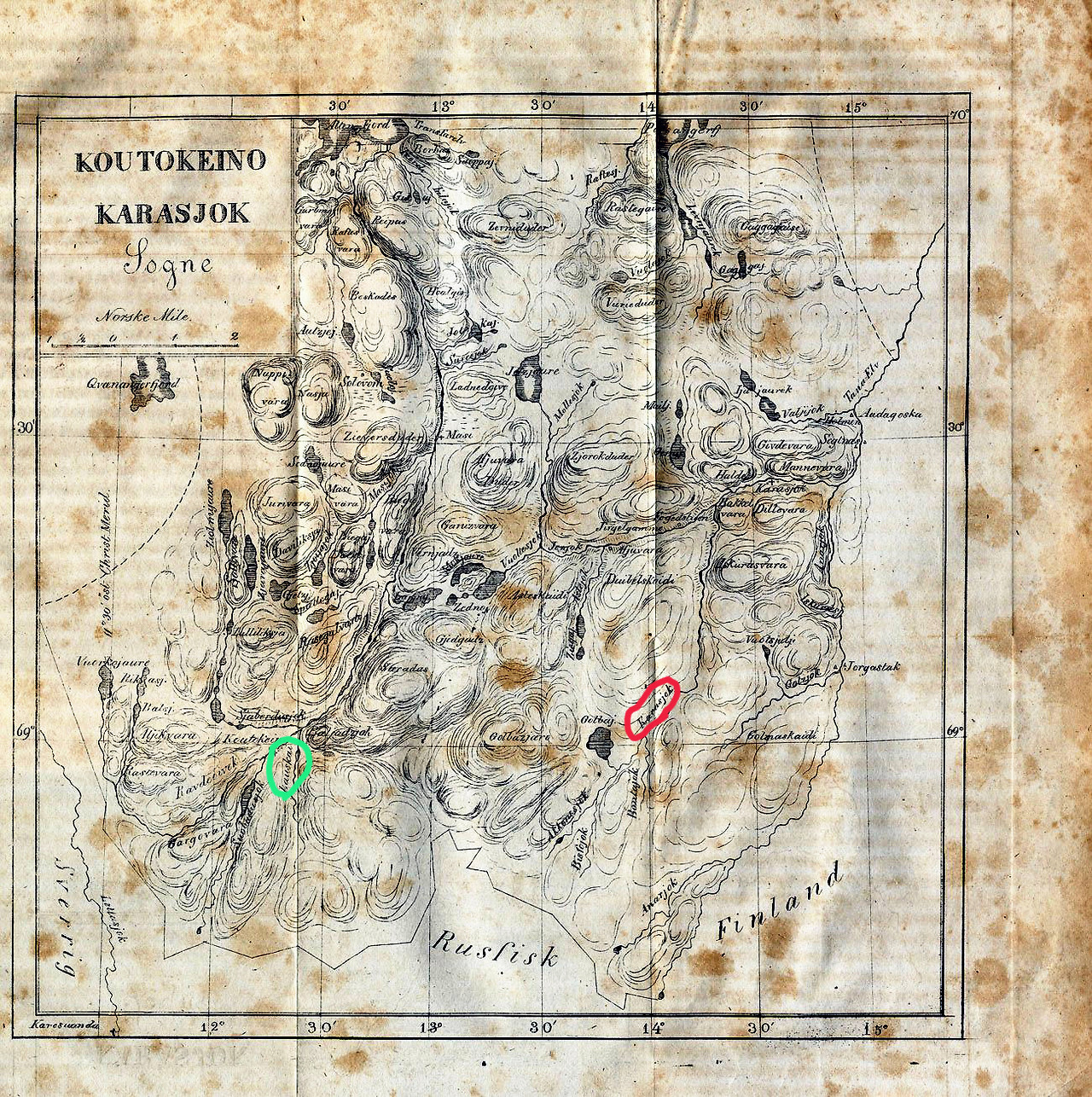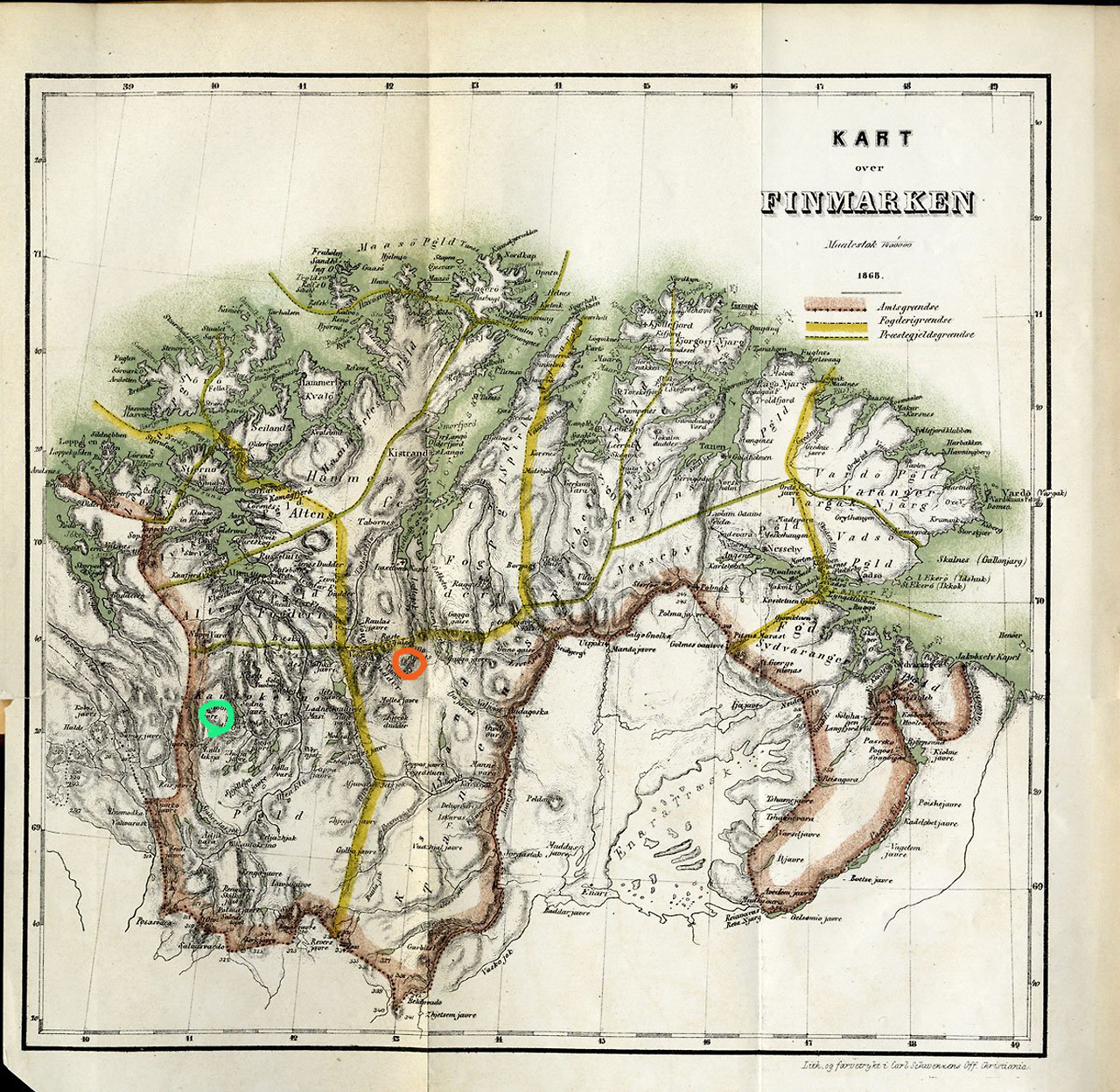 1) Kautokeino(초록색)와 Karasjok(붉은색)가 표시된 1842년도 지도, 2) 당시 사슴 사육 사진, 3) 라플란드 최북단 Finmark 지도(1868)에도 두 도시가 표시되어 있다.