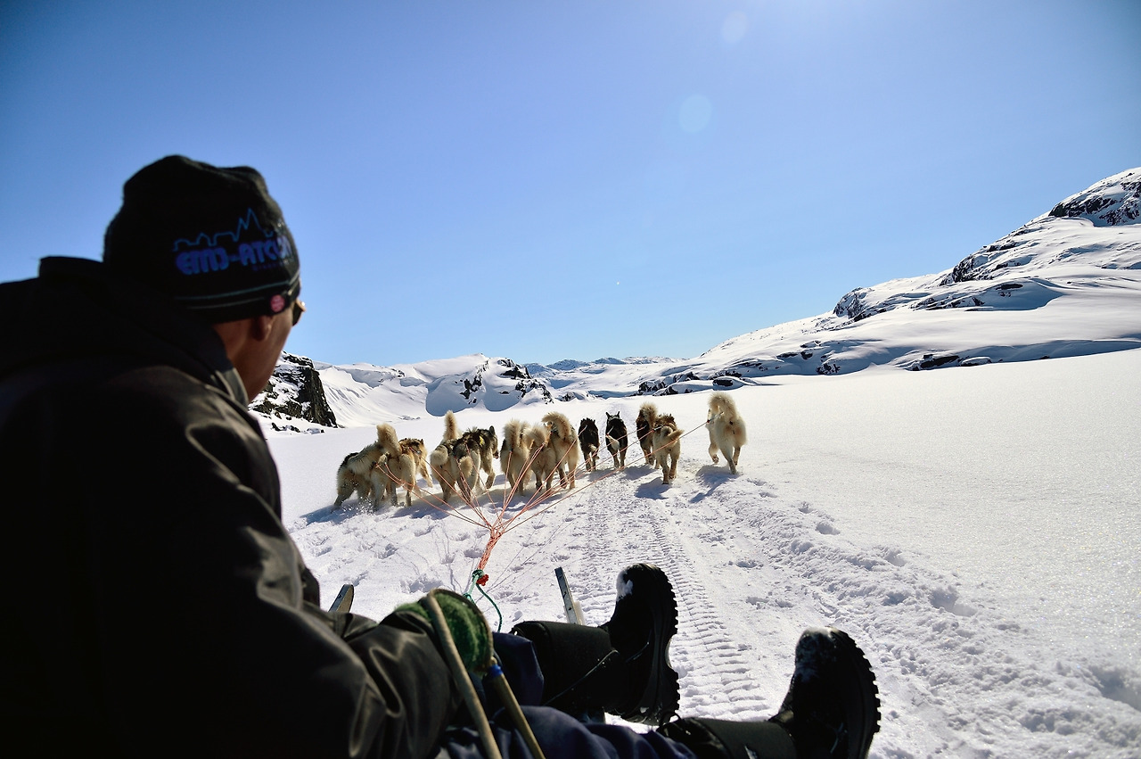 <사진 설명> 썰매는 모두 열다섯 마리의 개가 끄는데, 앞줄에 다섯 마리 뒷줄에 열 마리가 달린다. 앞줄에는 노련한 나이 백이 개들이 서고 뒷줄에는 경험이 적은 어린놈이 가운데, 좌우측에는 노련한 나이 먹은 녀석이 선다. 방향을 바꾸려 할 때는 마치 자동차 깜빡이처럼 뒷줄 좌우측 끝에 있는 개들에게 채찍으로 신호를 보내면 개들이 반응을 하고 좌우 방향으로 나아간다.