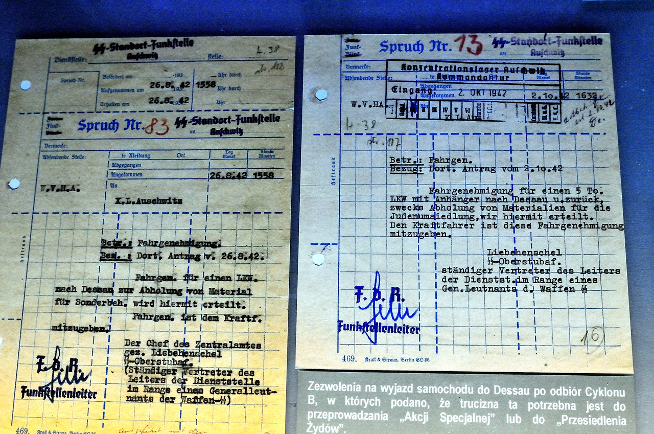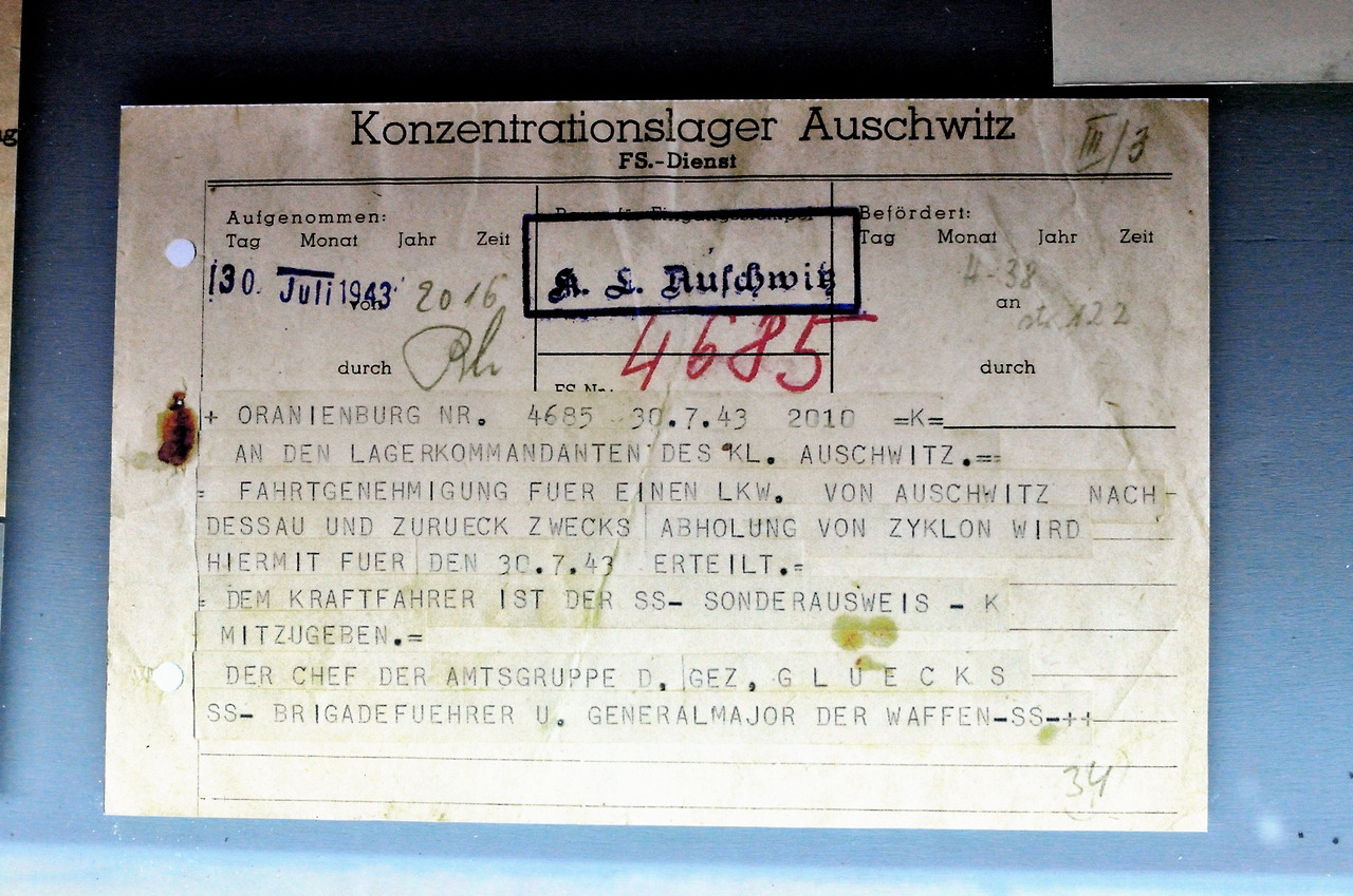 또한 비르케나우 수용소에서 기차를 하나 볼 수 있다. 마지막 기차라는 별명이 붙은 기차인데 이 열차는 사람을 태우기 위한 게 아니라, 실은 독가스의 원료인 사이클론을 실어 나르던 기차였다. 이와 함께 전시실에는 나치 수용소 통행증도 있다. 이 통행증은 1943년 7월 30일에 발행한 것인데, 다름 아닌 ‘사이클론’을 가지러, 즉 유태인을 죽일 독가스 원료를 수송하기 위한 열차 운행 허가증이었던 것이다.