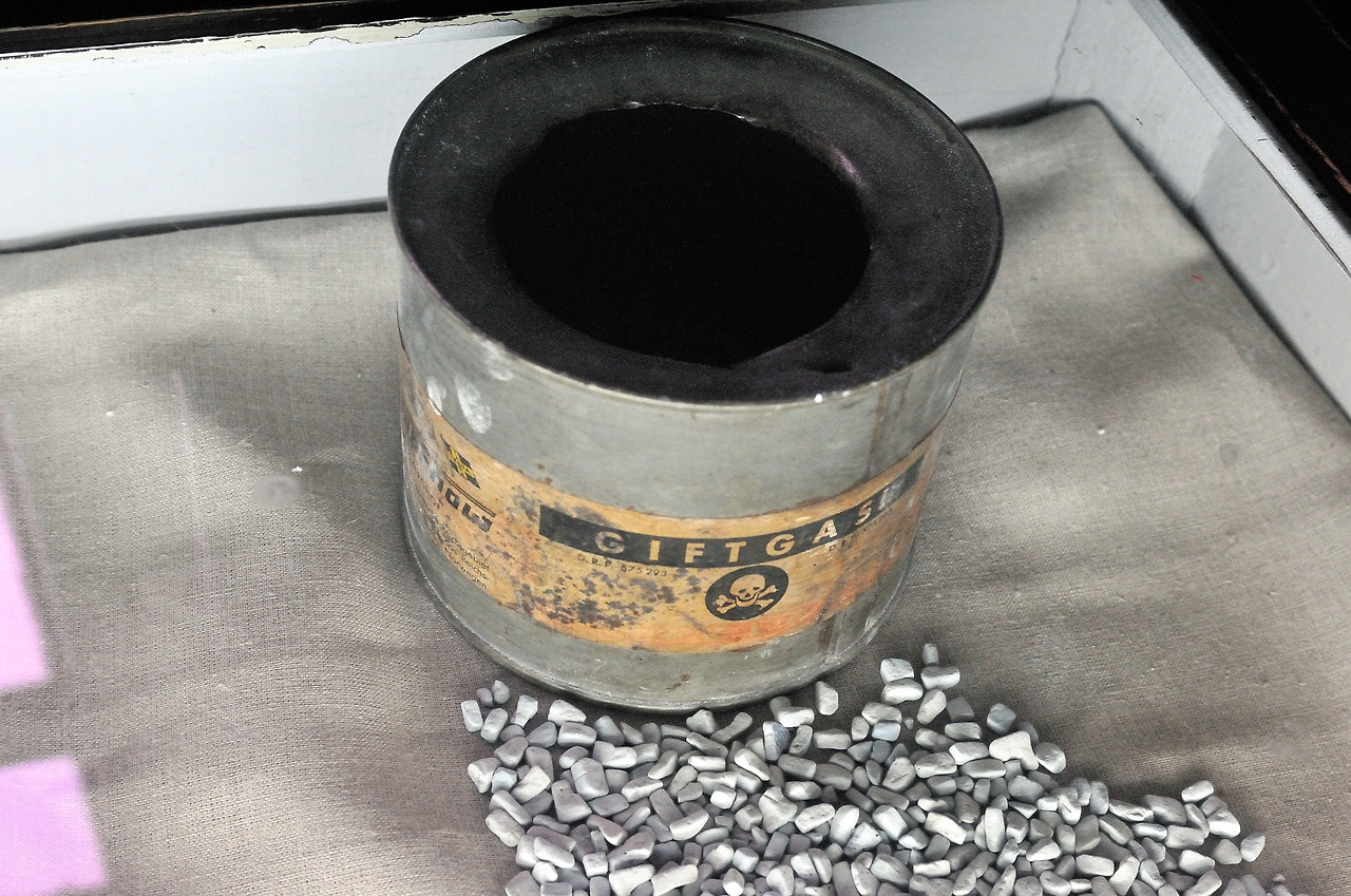 전시실에는 유태인 학살에 사용된 수많은 독 가스통들이 보인다. 작은 흰돌 조각들은 '사이클론 B'라는 독가스의 원료인데 한 줌만 있으면 수백 명을 죽일 수 있는 독가스를 만들 수 있다고 한다.