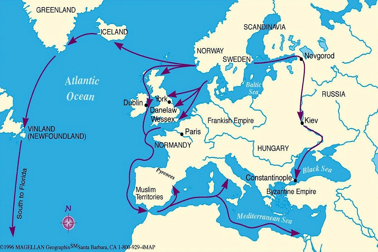 이 시기에 바이킹들은 모든 주변 국가들을 그들의 공격 대상으로 삼았다. 바이킹들은 스코틀랜드, 잉글랜드, 아일랜드, 프랑스와 이탈리아 남부, 그리고 심지어 내륙에 위치한 러시아 연안까지 모두 침공해 들어갔다. 사람들은 이들을 바이킹이라 불렸으며, 그들이 거쳐간 지역은 당연히 약탈과 정착이라는 이중적 행태를 보여주었다. 바이킹 흔적은 곳곳에 여러 형태로 남아 있는데 그 흔적은 그대로 바이킹의 세력 범위가 되었다.