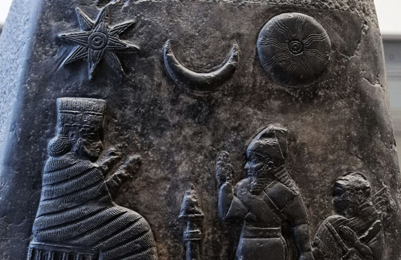8개의 꼭짓점 별은 이쉬타르의 상징, 둥근 원반은 여신의 동생 태양신 우트(Utu)를 나타내며 초승달은 아버지 다르이 신, 신(Sin)을 나타낸다, (루브르 박물관)