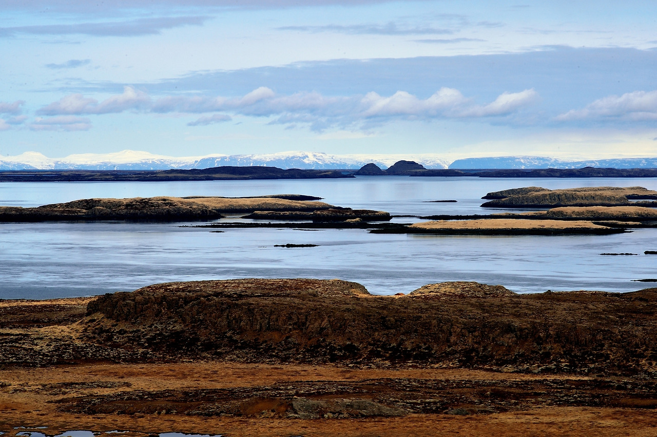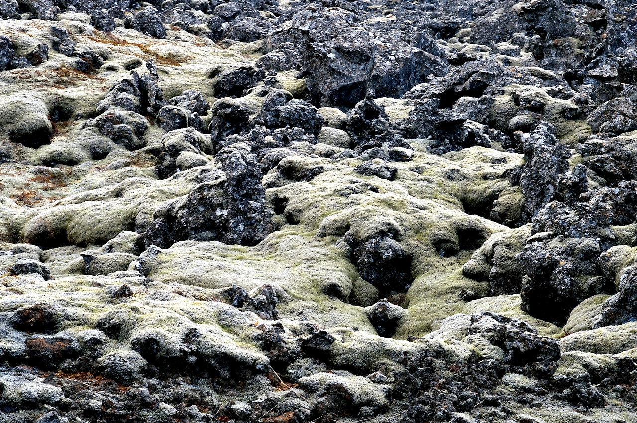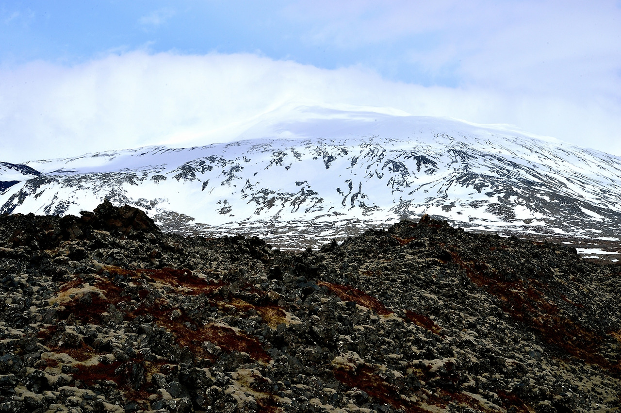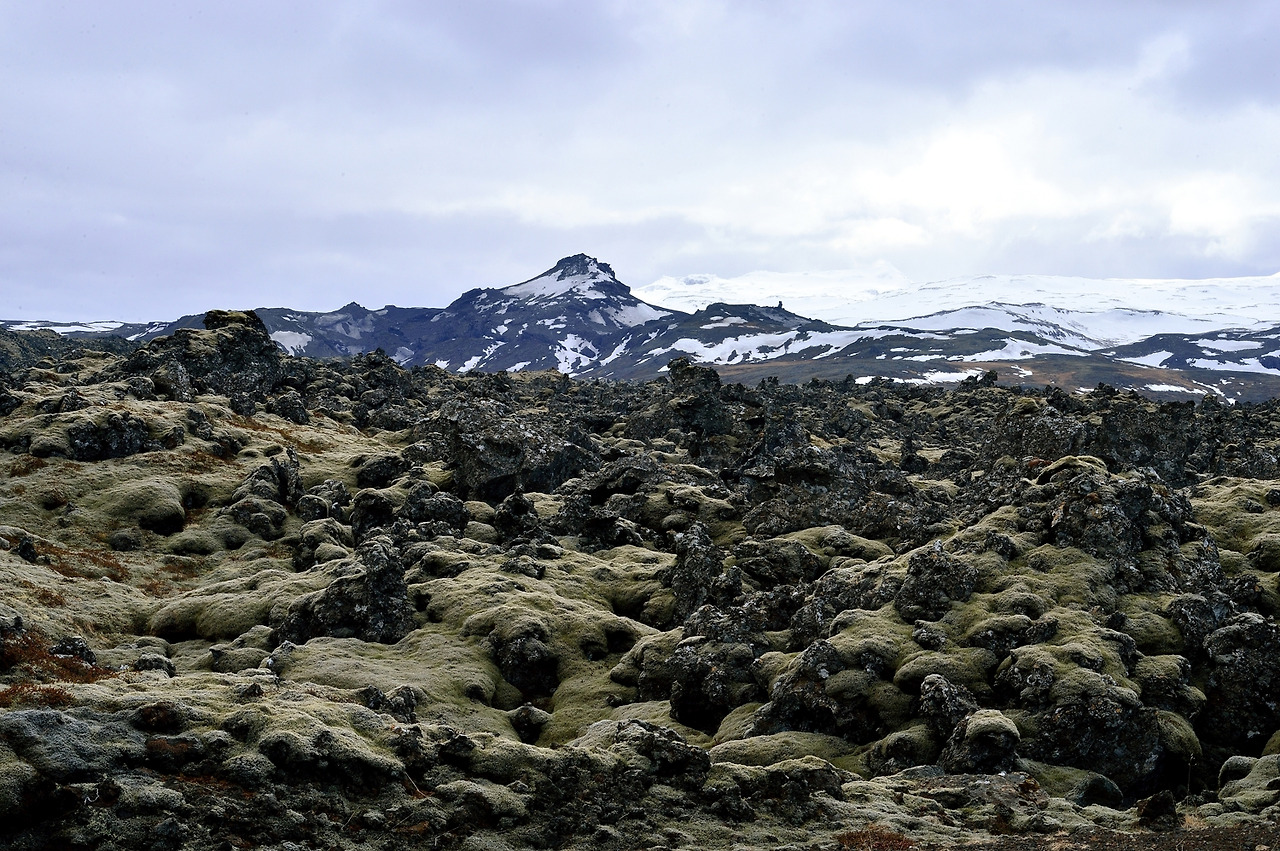 <사진 설명> 드리트비크(Dritvik) 지역의 용암들, 멀리 스네펠스빙하가 보이고 화산 폭발 후 용암과 화산재로 뒤덮인 벌판에 이끼들이 무성하게 자랐다.