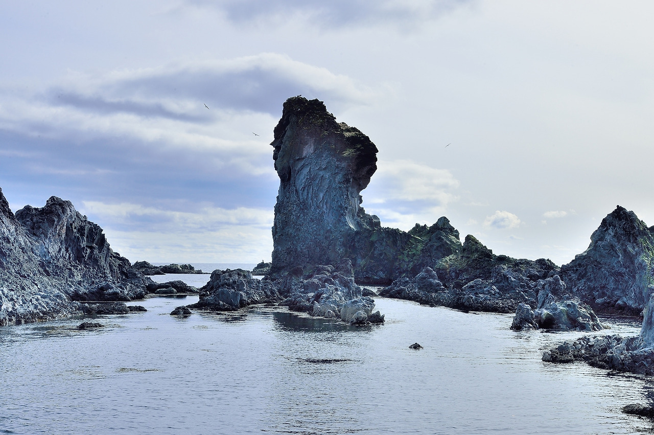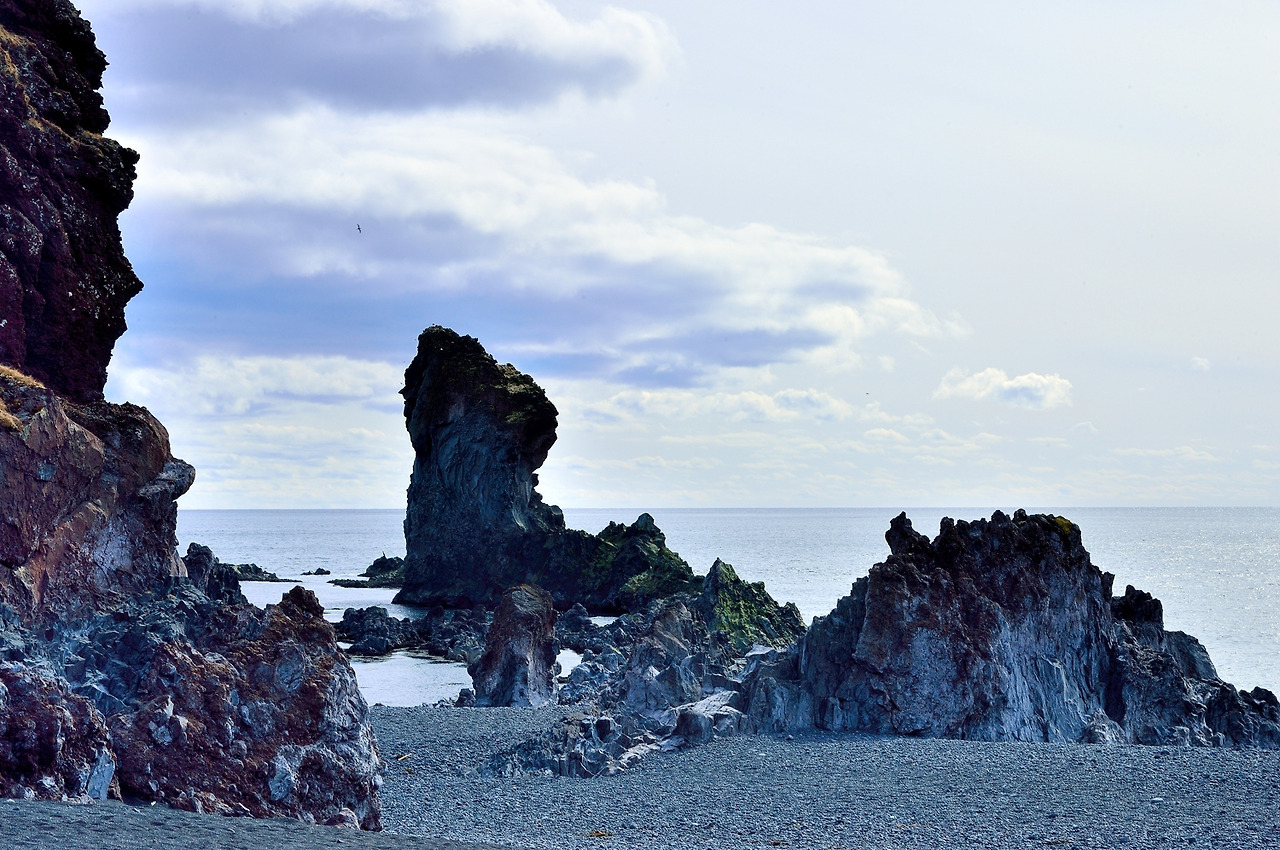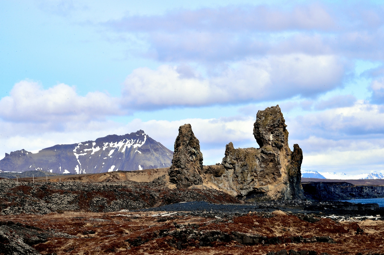 <사진 설명> 이 지역은 서해안 쪽에 있는 드리트비크(Dritvik)라는 지역인데, 16세기 중반부터 19세기 중반까지 아이슬란드의 어업 중심지로 전성기를 보냈다. 뿐만 아니라 이 지역은 용암 분출 흔적이 많이 보이는데 각각의 용암들은 스네펠스빙하가 생성되기 이전에 화산 폭발로 용암들이 바닷가로 흘러들어 바다와 만나면서 여러 가지 모양으로 굳어졌다. 특히 ‘트롤의 교회’라는 애칭을 가진 용암은 바닷가에서 햇빛을 받으며 우뚝 서있다.