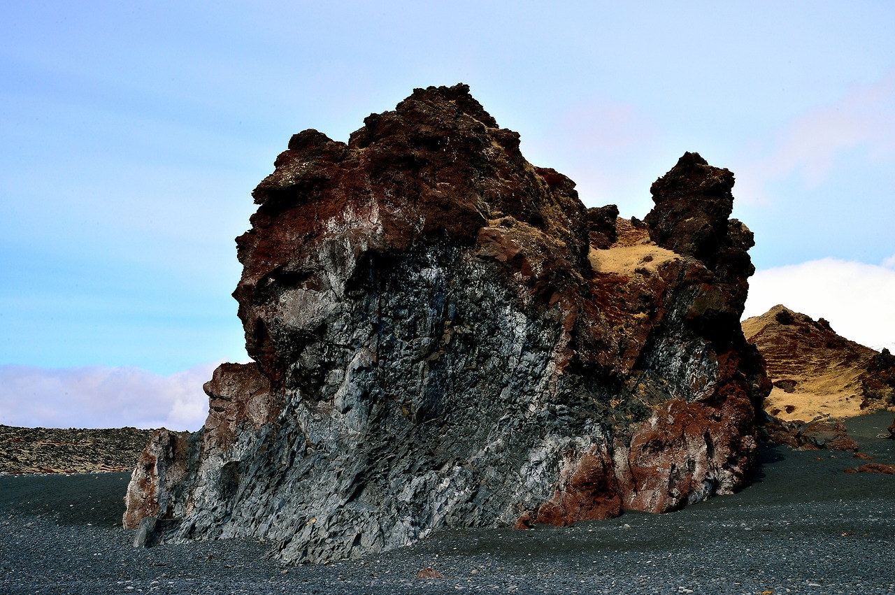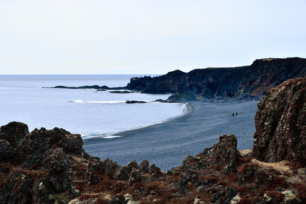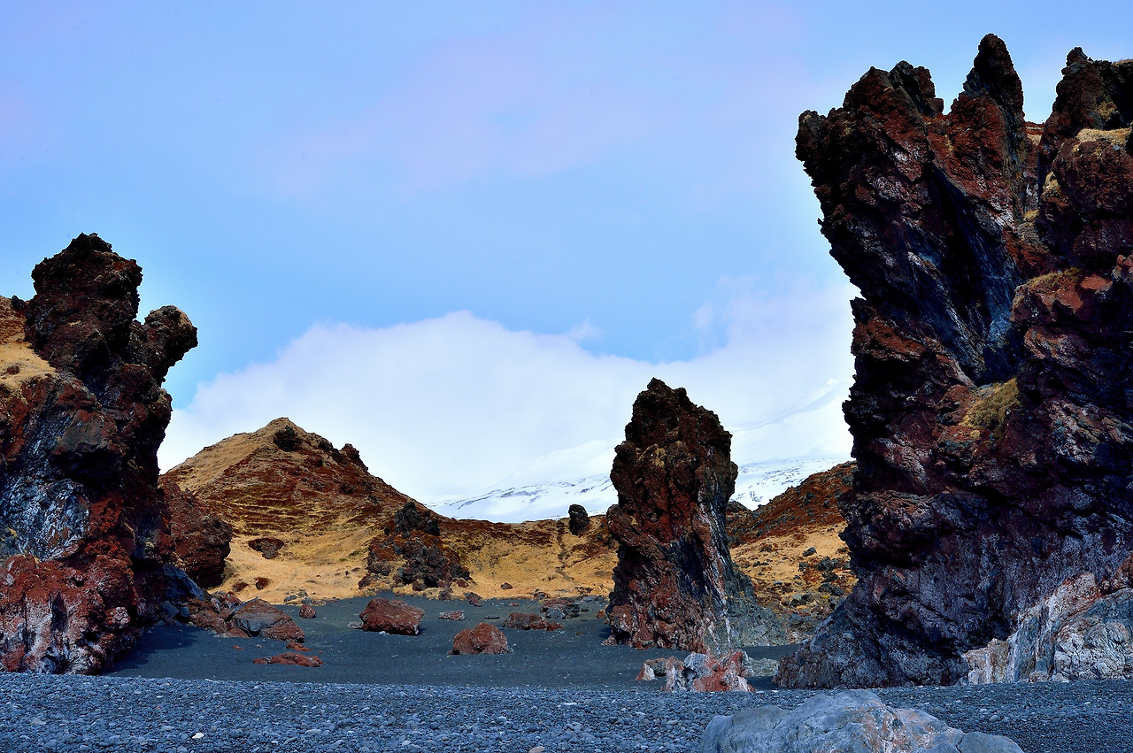 <사진 설명> 이 지역은 서해안 쪽에 있는 드리트비크(Dritvik)라는 지역인데, 16세기 중반부터 19세기 중반까지 아이슬란드의 어업 중심지로 전성기를 보냈다. 뿐만 아니라 이 지역은 용암 분출 흔적이 많이 보이는데 각각의 용암들은 스네펠스빙하가 생성되기 이전에 화산 폭발로 용암들이 바닷가로 흘러들어 바다와 만나면서 여러 가지 모양으로 굳어졌다. 특히 ‘트롤의 교회’라는 애칭을 가진 용암은 바닷가에서 햇빛을 받으며 우뚝 서있다.