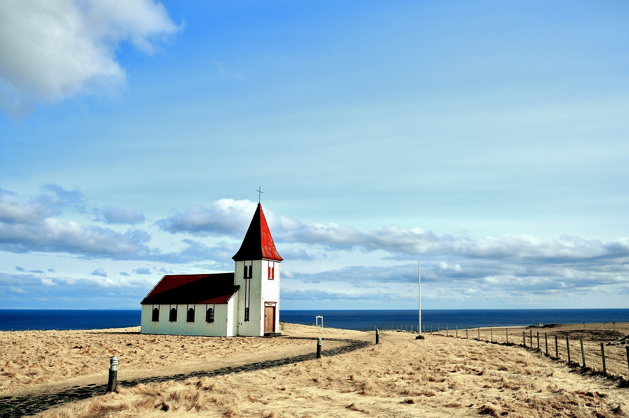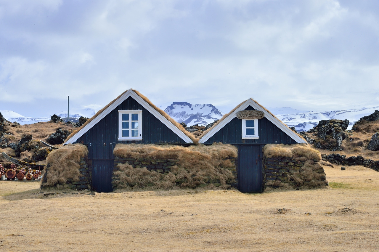 <사진 설명> 서북쪽 방향으로 가면서 만난 풍경들, 민속박물관도 보이고 바닷가에 용암이 흘러들어 애틋한 부부바위도 만들었다. 사진속 교회는 헬나르(Hellnar)지역에 세운 교회인데, 1880년도에 지었다. 목조로 지은 교회라 아이슬란드의 험한 날씨를 견디지 못해 몇 차례를 수리를 했다. 지금은 교회를 기념관으로만 사용하고 지역주민들의 예배를 위해서 근처에 새로운 교회를 지어 이용한다고 한다.