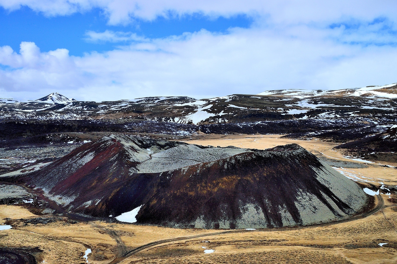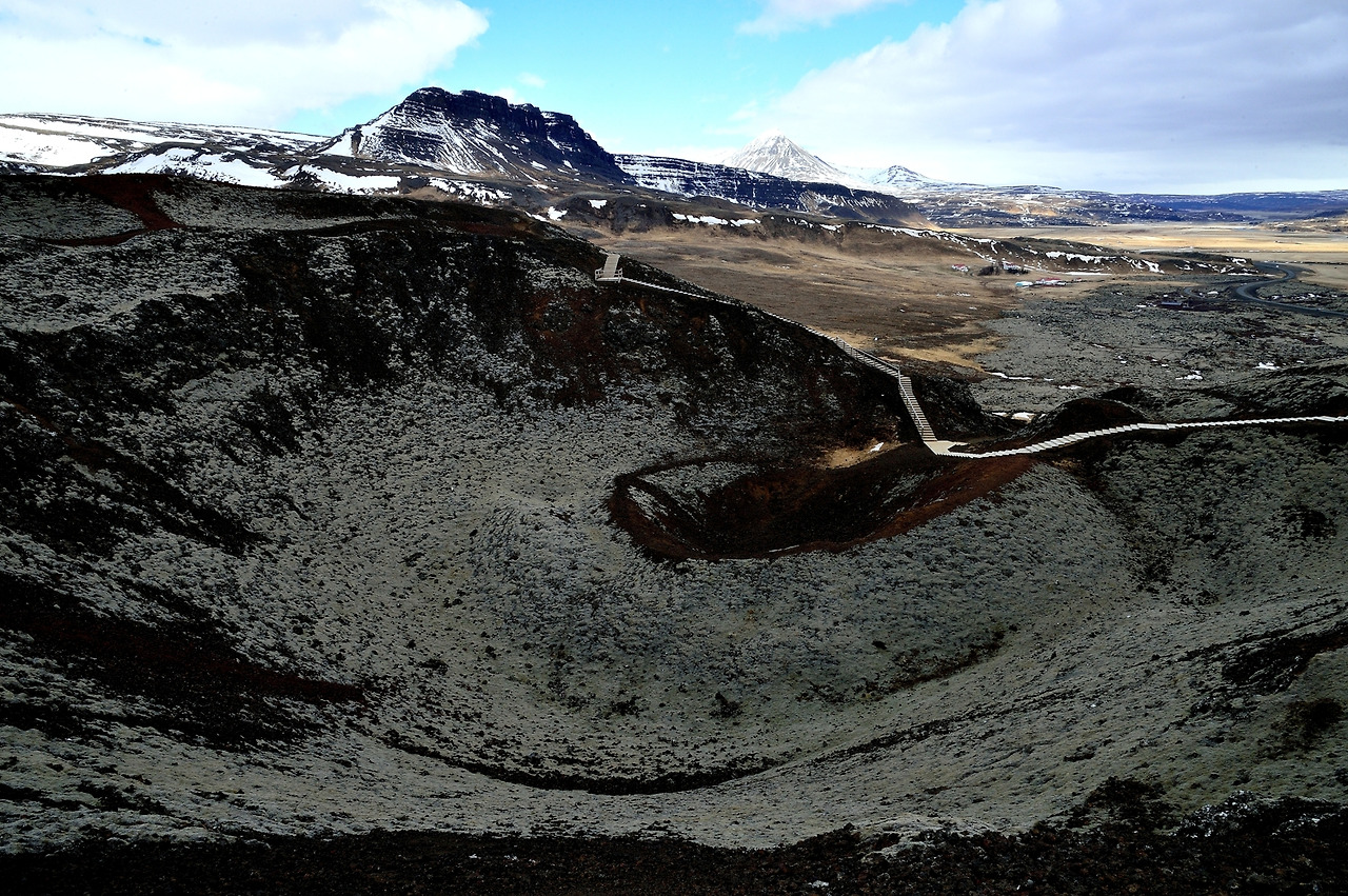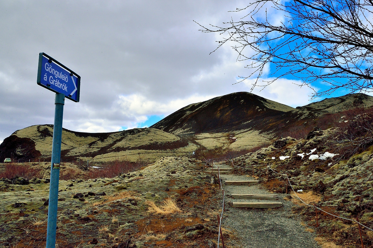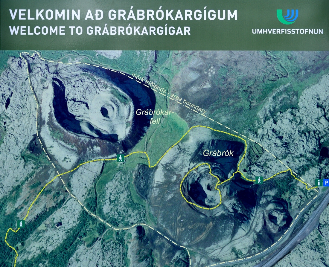 남쪽으로 조금 가다가 1번 도로를 만나는 지점에서 북쪽 아퀴레이리 방향으로 거꾸로 조금만 가면 화산 폭발 흔적을 관람할 수 있는 곳을 만난다. 그라브록(Grabrok)이라는 곳인데 이곳 화산지대의 특징을 잘 보여준다. 이곳은 화산 폭발 후 같은 장소에서 또다시 화산이 폭발해 이중화산이라고 불러야 할 것 같다. 처음 화산이 폭발을 한 후 같은 장소에서 2차 폭발이 잇따라 발생한 드문 경우이다.