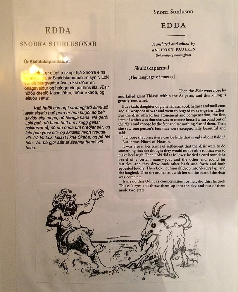 로키는 자신의 성기에 끈을 묶고 다른 한쪽은 염소의 수염에 끈을 묶는다. 염소가 움직이면 로키는 아프다고 소리를 질러대고, 로키가 움직이면 염소가 수염 때문에 음매애 하고 소리를 질러대는 바람에 아스가르드는 오랜만에 웃음바다가 되고 만다. 결국 스카디는 참지 못하고 웃음을 터뜨리고 만다.