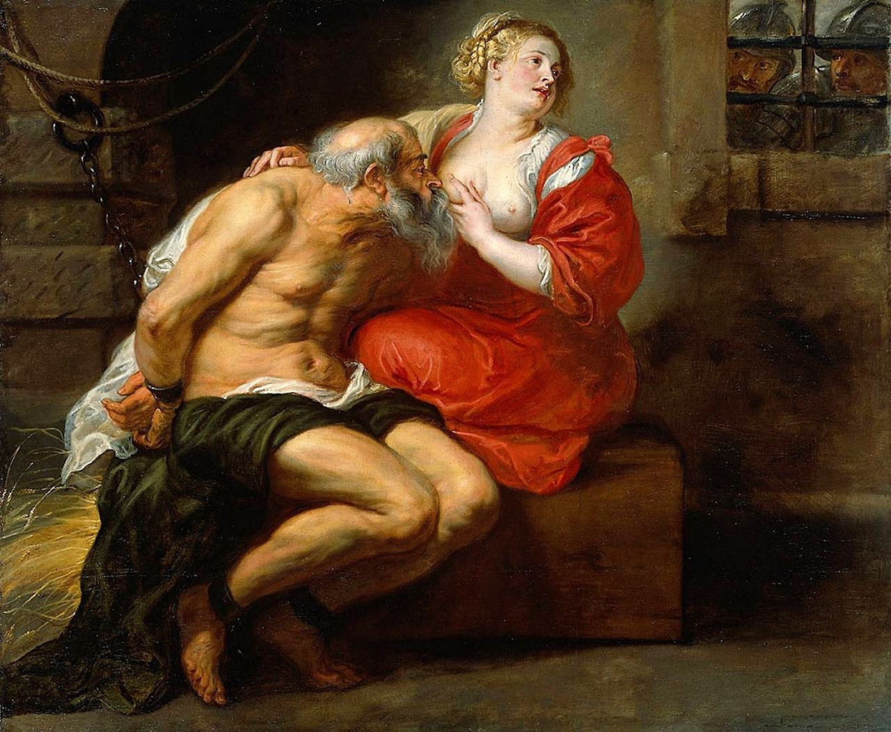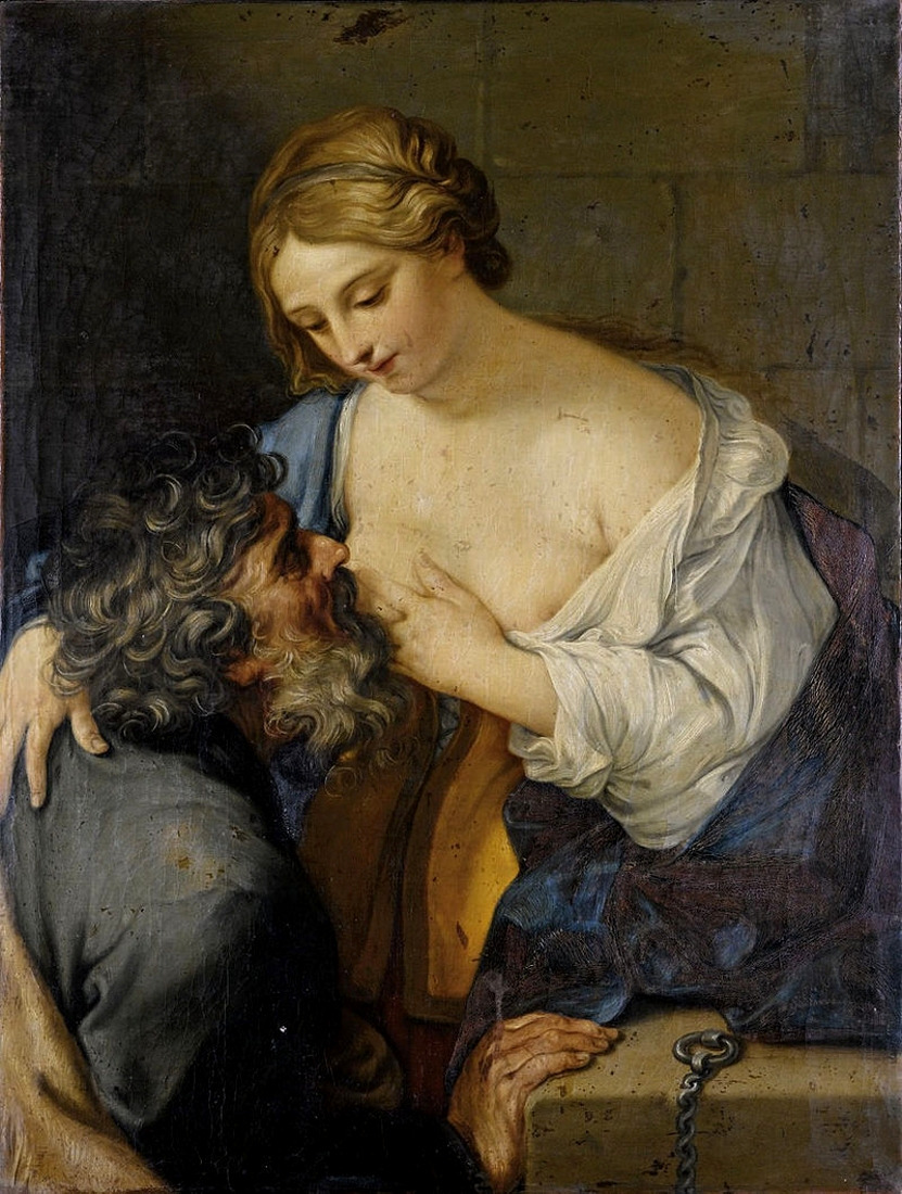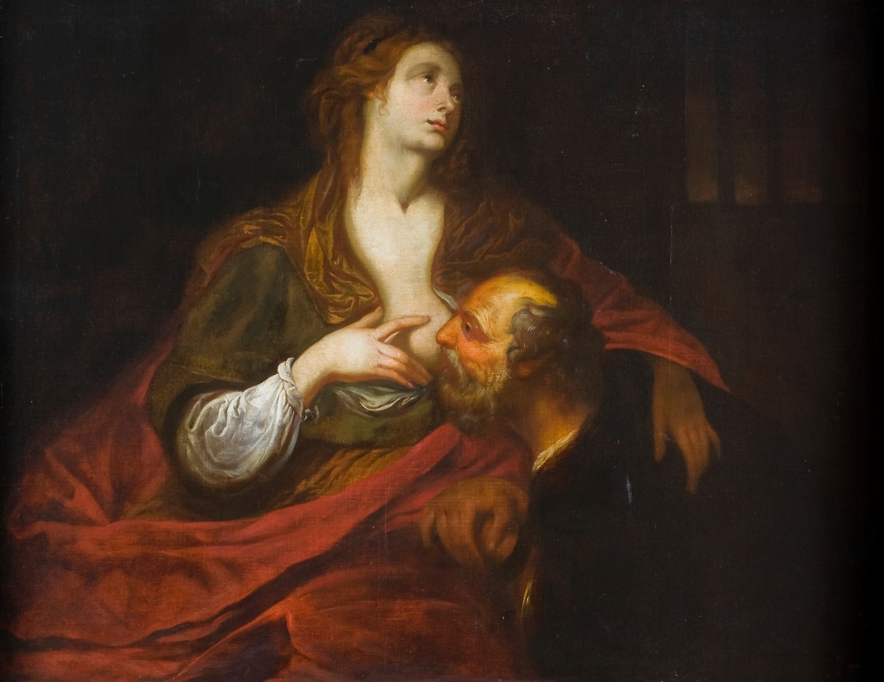 ‘카리타스 로마나’(Caritas Romana)라는 제목의 그림 속 노인의 이름은 ‘시몬‘, 여인은 그의 딸 ’ 페로‘. 딸은 감옥에서 죽어가는 아버지를 매일 찾아와 젖을 먹인다. 아버지가 죄를 지어 굶어 죽어야 하는 형벌을 받게 되었는데 감옥에서 굶어 죽어가는 아버지를 보다 못한 딸이 매일 감옥에 찾아와 젖을 먹여 아버지를 살린다는 이야기다. 그녀의 사랑에 감동한 로마 당국은 결국 시몬을 석방했다고 한다. 선정적인 그림이 숭고한 명화로 바뀌는 순간이다.