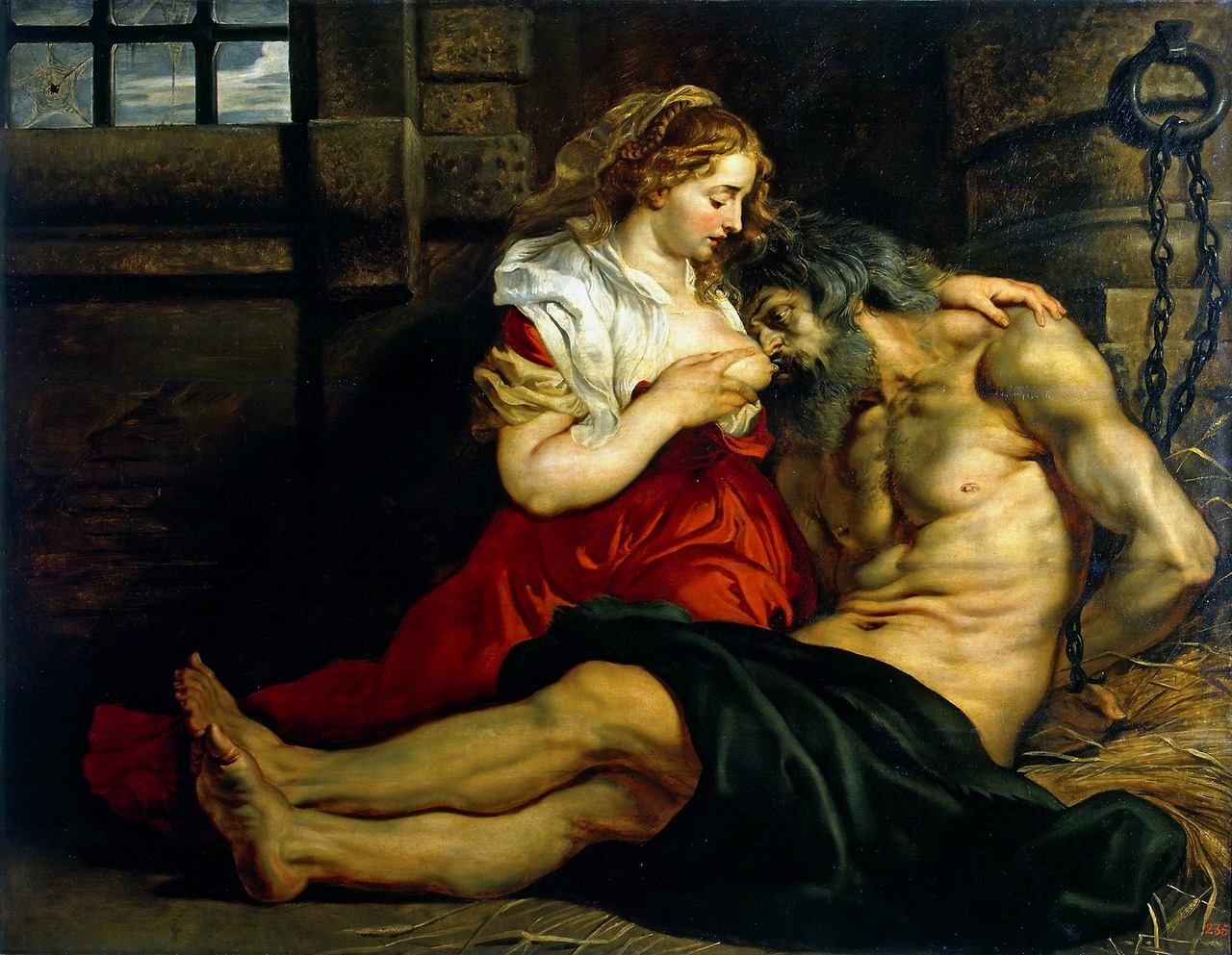 루벤스가 형상화한 효성이 지극한 딸과 그 딸에 의지해 생명을 이어가는 아버지의 모습은 사실 보기에 따라 매우 충격적이다. 아버지를 구하겠다는 효심과 다 큰 딸이 아버지에게 젖을 물리는 흔하지 않은 모습은 루벤스의 생동하는 그림으로 더욱 강렬하게 다가온다.