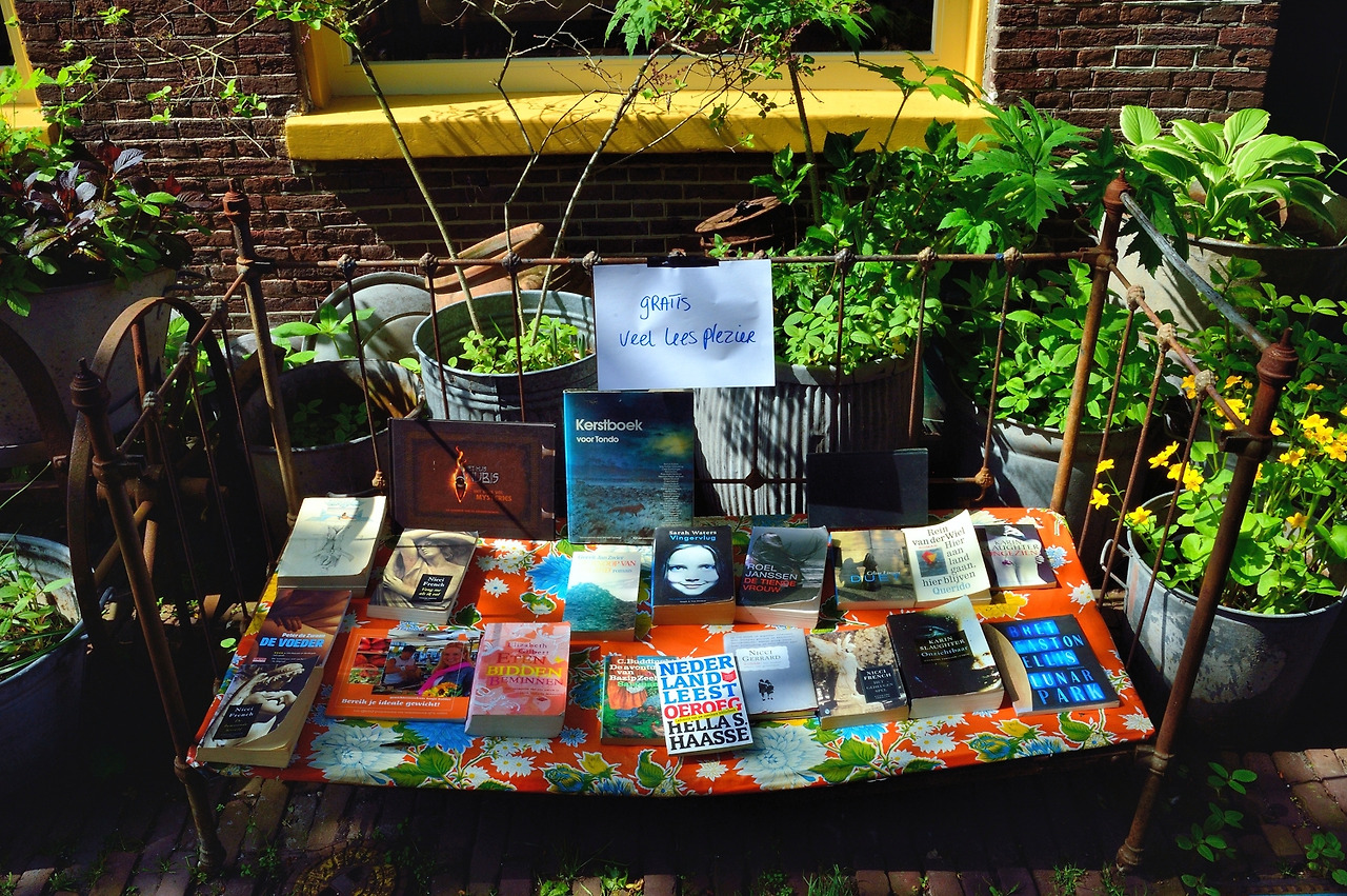 오른쪽: 어느 집 앞에 그냥 가져가라고 내놓은 책들, 소설류가 대부분인데 수십 권은 족히 될 분량이다.