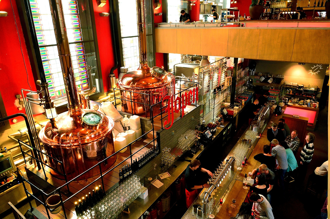 왼쪽: 양조장으로 개조한 요펜 교회 내부, 낮에는 카페와 점심을 제공하는 레스토랑으로 이용된다.
